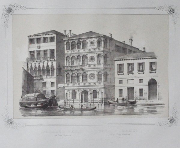 Litografia di 530 x 335 mm su carta di cellulosa. Incisione in cornice con stemmi delle famiglie Dario e Zichy agli angoli. In basso al centro, in italiano e francese: "Palazzo Dario ora Zichy Kolowrat a S. Gregorio - Palais Dario aujourd'hui Zichy Kolowrat à St. Gregoire". Più sotto "Venise, Joseph Kier Editeur, place S. Marco N° 117" Più sotto: "50". Proveniente da "Venezia monumentale e pittoresca" di Gianjacopo Fontana. Moro Marco (1817-1885): litografo, disegnatore, editore di stampe. Nato a Zenson di Piave (TV), morto a Venezia. 530 x 335 mm lithograph on cellulose paper. Engraving in the frame with the Dario and Zichy families coats of arms at the corners. Bottom center, in Italian and French: "Palazzo Dario ora Zichy Kolowrat a S. Gregorio - Palais Dario aujourd'hui Zichy Kolowrat à St. Gregoire". Below "Venise, Joseph Kier Editeur, place S. Marco N ° 117" Below: "50". Coming from "Monumental and picturesque Venice" by Gianjacopo Fontana. Moro Marco (1817-1885): lithographer, draftsman, print publisher. Born in Zenson di Piave (TV), died in Venice.