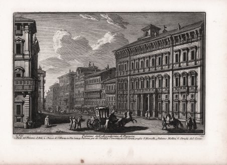 Veduta tratta dalla monumentale opera ' Delle magnificenze di Roma antica e moderna.Pubblicata in 10 volumi dal 1747 al 1761, l’opera presenta 238 incisioni in rame, ciascuna incisione con testo narrativo che fornisce informazioni storiche e documentarie. ' Conosciuto dai più semplicemente come il "maestro" di Giovanni Battista Piranesi, Giuseppe Vasi rivela in quest'opera monumentale la pienezza della sua creatività grafica. I 10 libri che la compongono hanno ognuno un frontespizio con titolo e data diversi: ' Libro primo che contiene le porte e mura; Libro secondo, che contiene le piazze principali di Roma con obelischi, colonne, ed altri ornamenti; Libro terzo, che contiene le basiliche e chiese antiche di Roma; Libro quarto che contiene i palazzi e le vie più celebri; Libro quinto che contiene i ponti e gli edifizj sul Libro sesto che contiene la chiese parrocchiali; Libro settimo che contiene i conventi e case dei chierici regolari; Libro ottavo che contiene i monasteri e conservatorj di donne; Libro nono che contiene i collegj, spedali, e luoghi pii; decimo che contiene le ville e giardini più rimarchevoli. Le ' Magnificenze ' forniscono un panorama completo e al tempo stesso anticonvenzionale dell'Urbe: così, insieme alle consuete, celeberrime inquadrature desunte dalla migliore tradizione vedutistica, si trova anche una Roma insolita, quella che, talvolta, non esiste più. A quest'opera, di centrale importanza nell'editoria romana di metà Settecento, l'Autore aveva lavorato per quasi un ventennio realizzando una monumentale guida dell'Urbe dove accanto alle consuete e celeberrime inquadrature tratte dalla migliore tradizione vedutistica, immortala anche scorci insoliti che sono poi scomparsi con il cambiare della città. Il testo che accompagna le vedute nel primo volume è opera di Giuseppe Bianchini, nel secondo di Orazio Orlandi e nei restanti del Vasi stesso. A partire dall'edizione del 1786, l'opera del Vasi, fu aggiornata dal figlio Mariano, che la pubblicò col titolo ' Raccolta delle più belle vedute antiche, e moderne di Roma, mostrando solo il nome del padre come autore. Questa nuova edizione presentava molte tavole della prima edizione, ed alcune nuove. Anche la pubblicazione di Mariano Vasi fu stampata più volte, sempre con l’aggiunta di nuove tavole. Esemplare tratto dalla seconda edizione del 1772. Acquaforte, stampata su carta vergata coeva, completa dei margini, in ottimo stato di conservazione. ' View taken from the monumental work ' Delle magnificenze di Roma antica e moderna. Published in 10 volumes from 1747 to 1761, the work features 238 copper engravings, each engraving with a narrative text that provides historical and documentary information. Known by most simply as the "master" of Giovanni Battista Piranesi, Giuseppe Vasi reveals in this monumental work the fullness of his graphic creativity. The 10 books that compose it each have a title page with a different title and date: ' Libro primo che contiene le porte e mura; Libro secondo, che contiene le piazze principali di Roma con obelischi, colonne, ed altri ornamenti; Libro terzo, che contiene le basiliche e chiese antiche di Roma; Libro quarto che contiene i palazzi e le vie più celebri; Libro quinto che contiene i ponti e gli edifizj sul Libro sesto che contiene la chiese parrocchiali; Libro settimo che contiene i conventi e case dei chierici regolari; Libro ottavo che contiene i monasteri e conservatorj di donne; Libro nono che contiene i collegj, spedali, e luoghi pii; decimo che contiene le ville e giardini più rimarchevoli. The ' Magnificences ' provide a complete and at the same time unconventional panorama of the City: thus, together with the usual, celebrated shots taken from the best tradition of ' vedutistica, one also finds an unusual Rome, one that, at times, no longer exists. The author had worked on this work, of central importance in Roman publishing in the middle of the eighteenth century, for almost twenty years, producing a monumental guide to the “Urbe” where, alongside the usual and famous shots taken from the best tradition of ' vedutistica, he also immortalized unusual views that have since disappeared with the change of the city. The text that accompanies the views in the first volume is by Giuseppe Bianchini, in the second by Orazio Orlandi and in the remaining ones by Vasi himself. Starting from the edition of 1786, the work of Vasi, was updated by his son Mariano, who published it under the title ' Raccolta delle più belle vedute antiche, e moderne di Roma, showing only the name of his father as author. This new edition presented many plates of the first edition, and some new ones. The publication of Mariano Vasi was also printed several times, always with the addition of new plates. ' View taken from the second edition of the Vasi’s ' Delle Magnificenze di Roma Antica e Moderna ' (first edition, in X books, published between 1747-61), edited in 1772. Etching, printed on contemporary laid paper, in very good condition. Cfr. Scalabroni 271.