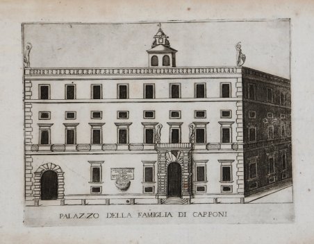Veduta tratta dalla rarissima serie "Palazzi divesi nel'Alma Cità di Roma et altre", pubblicata per la prima volta nel 1638 da Giovanni Battista de Rossi e successivamente ristampata nel 1640, 1650 e nel 1655. L'opera comprende incisioni di famosi palazzi romani e non. Acquaforte e bulino, in ottimo stato di coservazione. Rara. View taken from the rare book "Palazzi divesi nel'Alma Cità di Roma et altre", published for the first time in 1638 by Giovanni Battista de Rossi and subsequently reprinted in 1640, 1650 and 1655. The work includes recordings of famous buildings in Rome and elsewhere. Etching and engraving, in excellent condition. Rare. Cfr.