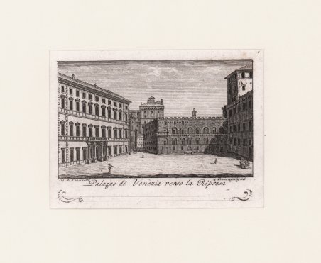 Veduta tratta dalla celebre Raccolta di num. 320 Vedute sì antiche, che moderne della città di Roma. …Incise a bulino in N. 80 rami, In Roma Nella Calcografia di Agapito Franzetti a Torsanguigna Col Permesso. ' L’opera si compone di un frontespizio calcografico e di 80 tavole numerate, ognuna composta da quattro vedute. Viene stampata senza data; molti repertori la datano intorno al 1790 circa, forse perché stampata su carta vergata. Una datazione intorno al 1800 ci sembra tuttavia più plausibile. ' Agapito Franzetti, calcografo attivo a Roma con bottega tra via del Corso e Torsanguigna, è noto per le sue piccole incisioni di veduta che servivano spesso come biglietti da visita. Tutte contengono, infatti, una linea in basso, dove si poteva apporre il proprio nome ad inchiostro. Come indicato nel titolo, le vedute raffigurano sia monumenti e antiche rovine che vedute “moderne”, con piazze, chiese e ville. Ciascuna tavola reca, in basso al centro, il nome dell’incisore. Gli artisti coinvolti sono sei: Jean-Jerome Baugean; Antonio Giuseppe Barbazza; Giovanni Battista Cipriani; Francesco Morelli; Antonio Poretta e Domenico Pronti. Molte delle vedute derivano dalla celebre opera di Giuseppe Vasi, Delle magnificenze di Roma antica e moderna. Pubblicata in 10 volumi dal 1747 al 1761, l’opera presenta 238 incisioni in rame, ciascuna incisione con testo narrativo che fornisce informazioni storiche e documentarie. ' Acquaforte, in buono stato di conservazione. ' Bibliografia: A. Bertarelli, H. Prior, Il biglietto da visita italiano. Contributo alla storia del costume e dell'incisione nel secolo XVII, Bergamo 1911, p. 162. View of the city printed in Rome by the publisher Agapito Franzetti. Taken from Raccolta di num. 320 Vedute sì antiche, che moderne della città di Roma. …Incise a bulino in N. 80 rami, In Roma Nella Calcografia di Agapito Franzetti a Torsanguigna Col Permesso. ' The work consists of an intaglio frontispiece and 80 numbered plates, each consisting of four views. It is printed without date; many repertories date it around 1790, perhaps because it was printed on laid paper. A date around 1800 seems more plausible. Franzetti, a chalcographer working in Rome with a workshop between Via del Corso and Torsanguigna, is known for his small engravings of views that were often used as business cards. They all contain a line at the bottom where one's name could be written in ink. The small views were often printed four to a sheet. As indicated in the title, the views depict both monuments and ancient ruins and "modern" views, with squares, churches and villas. Each table bears, at the bottom center, the name of the engraver. There are six artists involved: Jean-Jerome Baugean; Antonio Giuseppe Barbazza; Giovanni Battista Cipriani; Francesco Morelli; Antonio Poretta and Domenico Pronti. ' The views are made after Giuseppe Vasi’s monumental work Delle magnificenze di Roma antica e moderna. Published in 10 volumes from 1747 to 1761, the work features 238 copper engravings, each engraving with a narrative text that provides historical and documentary information. ' Bibliografia: A. Bertarelli, H. Prior, Il biglietto da visita italiano. Contributo alla storia del costume e dell'incisione nel secolo XVII, Bergamo 1911, p. 162. Cfr.