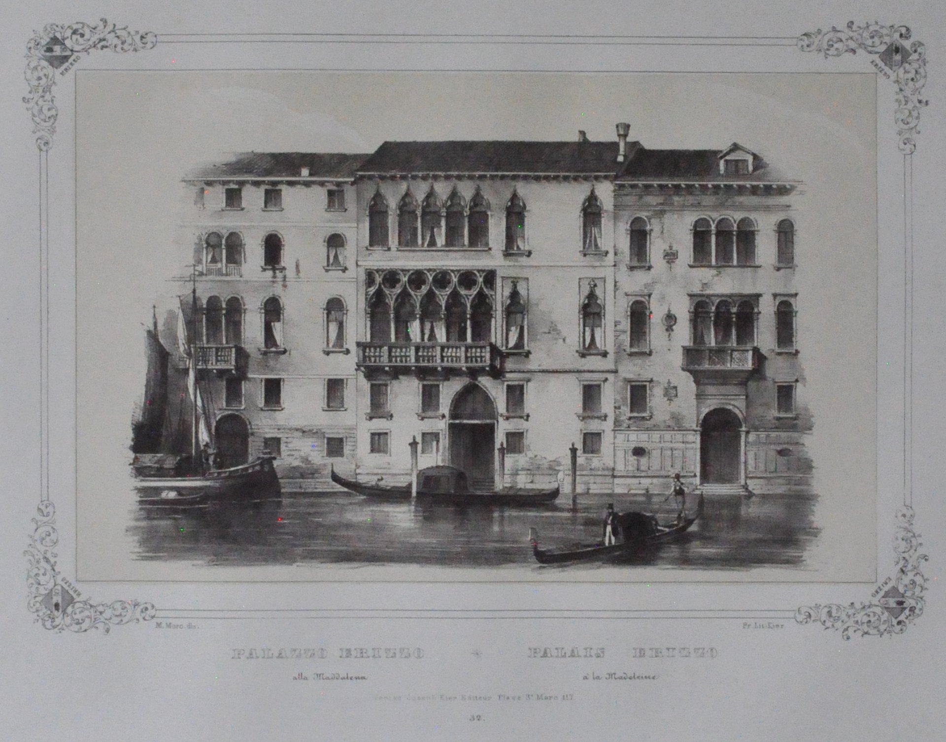 Litografia di 530 x 335 mm su carta di cellulosa. Incisione in cornice con stemmi della famiglia Erizzo agli angoli. In basso al centro, in italiano e francese: "Palazzo Erizzo alla Maddalena- Palais Erizzo a la Madaleine". Più sotto "Venise, Joseph Kier Editeur, place S. Marco N° 117" Più sotto: "32". Proveniente da "Venezia monumentale e pittoresca" di Gianjacopo Fontana. Moro Marco (1817-1885): litografo, disegnatore, editore di stampe. Nato a Zenson di Piave (TV), morto a Venezia.530 x 335 mm lithograph on cellulose paper. Engraving in the frame with the Erizzo family coats of arms at the corners. Bottom center, in Italian and French: "Palazzo Erizzo alla Maddalena - Palais Erizzo a la Madaleine". Below "Venise, Joseph Kier Editeur, place S. Marco N ° 117" Below: "32". Coming from "Monumental and picturesque Venice" by Gianjacopo Fontana. Moro Marco (1817-1885): lithographer, draftsman, print publisher. Born in Zenson di Piave (TV), died in Venice.