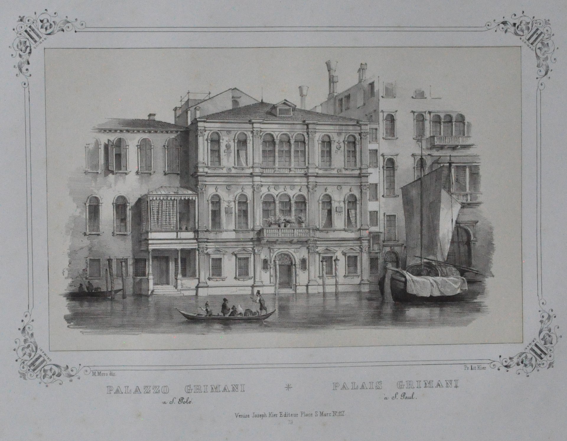 Litografia di 530 x 335 mm su carta di cellulosa. Incisione in cornice con stemmi della famiglia Grimani agli angoli. In basso al centro, in italiano e francese: "Palazzo Grimani a S. Polo - Palais Grimani à S. Paul". Più sotto "Venise, Joseph Kier Editeur, place S. Marco N° 117" Più sotto: "79". Proveniente da "Venezia monumentale e pittoresca" di Gianjacopo Fontana. Moro Marco (1817-1885): litografo, disegnatore, editore di stampe. Nato a Zenson di Piave (TV), morto a Venezia. 530 x 335 mm lithograph on cellulose paper. Engraving in the frame with the Grimani family coats of arms at the corners. Bottom center, in Italian and French: "Palazzo Grimani a S. Polo - Palais Grimani à S. Paul". Below "Venise, Joseph Kier Editeur, place S. Marco N ° 117" Below: "79". Coming from "Monumental and picturesque Venice" by Gianjacopo Fontana. Moro Marco (1817-1885): lithographer, draftsman, print publisher. Born in Zenson di Piave (TV), died in Venice.