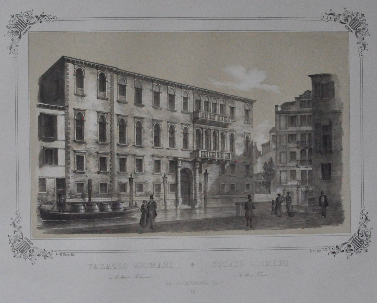Litografia di 530 x 335 mm su carta di cellulosa. Incisione in cornice con stemmi della famiglia Grimani agli angoli. In basso al centro, in italiano e francese: "Palazzo Grimani a St. Maria Formosa - Palais Grimani a St. Marie Formosa". Più sotto "Venise, Joseph Kier Editeur, place S. Marco N° 117" Più sotto: "70". Proveniente da "Venezia monumentale e pittoresca" di Gianjacopo Fontana. Moro Marco (1817-1885): litografo, disegnatore, editore di stampe. Nato a Zenson di Piave (TV), morto a Venezia.530 x 335 mm lithograph on cellulose paper. Engraving in the frame with the Mocenigo families coats of arms at the corners. Bottom center, in Italian and French: "Palazzo Grimani a St. Maria Formosa - Palais Grimani a St. Marie Formosa". Below "Venise, Joseph Kier Editeur, place S. Marco N ° 117" Below: "70". Coming from "Monumental and picturesque Venice" by Gianjacopo Fontana. Moro Marco (1817-1885): lithographer, draftsman, print publisher. Born in Zenson di Piave (TV), died in Venice.
