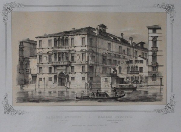 Litografia di 530 x 335 mm su carta di cellulosa. Incisione in cornice con stemmi delle famiglie Gussoni e Grimani agli angoli. In basso al centro, in italiano e francese: "Palazzo Gussoni ora Della Vida a S. Felice - Palais Gussoni aujourd'hui Della Vida à S. Felix". Più sotto "Venise, Joseph Kier Editeur, place S. Marco N° 117" Più sotto: "47". Proveniente da "Venezia monumentale e pittoresca" di Gianjacopo Fontana. Moro Marco (1817-1885): litografo, disegnatore, editore di stampe. Nato a Zenson di Piave (TV), morto a Venezia. 530 x 335 mm lithograph on cellulose paper. Engraving in the frame with the Gussoni and Grimani families coats of arms at the corners. Bottom center, in Italian and French: "Palazzo Gussoni ora Della Vida a S. Felice - Palais Gussoni aujourd'hui Della Vida à S. Felix". Below "Venise, Joseph Kier Editeur, place S. Marco N ° 117" Below: "47". Coming from "Monumental and picturesque Venice" by Gianjacopo Fontana. Moro Marco (1817-1885): lithographer, draftsman, print publisher. Born in Zenson di Piave (TV), died in Venice.