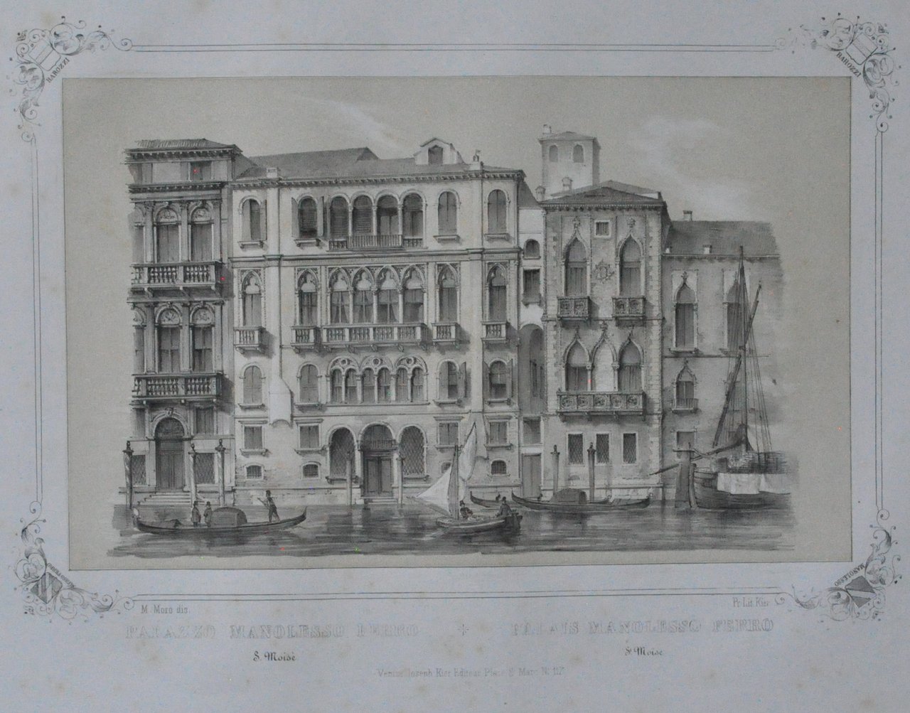 Litografia di 530 x 335 mm su carta di cellulosa. Incisione in cornice con stemmi delle famiglie Barozzi, Manolesso e Manolesso Ferro. In basso al centro, in italiano e francese: "Palazzo Manolesso Ferro S. Moisè - Palais Manolesso Ferro S. Moise". Più sotto "Venise, Joseph Kier Editeur, place S. Marco N° 117" Più sotto: "71". Proveniente da "Venezia monumentale e pittoresca" di Gianjacopo Fontana. Moro Marco (1817-1885): litografo, disegnatore, editore di stampe. Nato a Zenson di Piave (TV), morto a Venezia. 530 x 335 mm lithograph on cellulose paper. Engraving in the frame with the Barozzi, Manolesso e Manolesso Ferro families coats of arms at the corners. Bottom center, in Italian and French: "Palazzo Manolesso Ferro S. Moisè - Palais Manolesso Ferro S. Moise". Below "Venise, Joseph Kier Editeur, place S. Marco N ° 117" Below: "71". Coming from "Monumental and picturesque Venice" by Gianjacopo Fontana. Moro Marco (1817-1885): lithographer, draftsman, print publisher. Born in Zenson di Piave (TV), died in Venice.