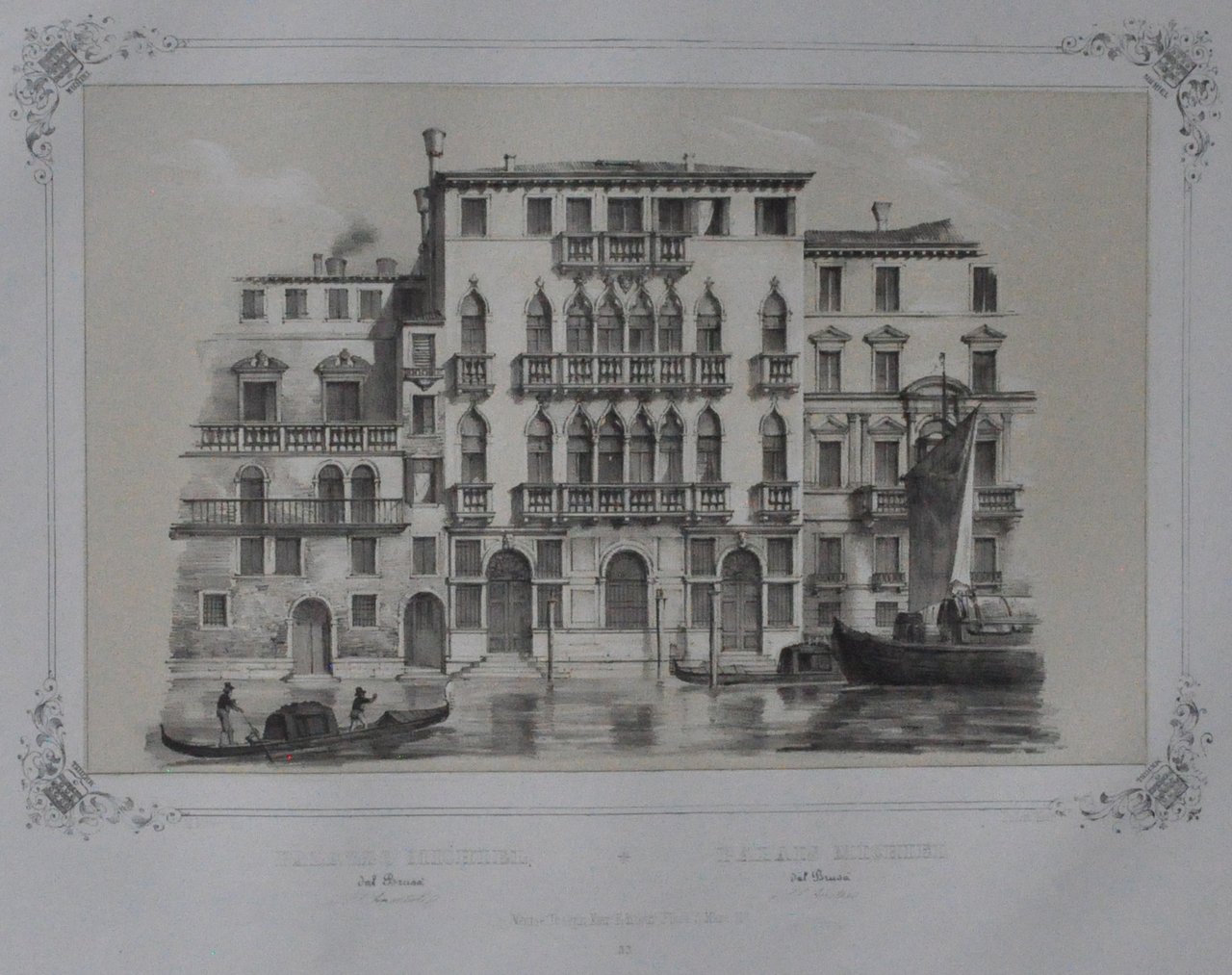 Litografia di 530 x 335 mm su carta di cellulosa. Incisione in cornice con stemmi della famiglia Michiel agli angoli. In basso al centro, in italiano e francese: "Palazzo Michiel dal Brusà a SS Apostoli - Palais Michiel dal Brusà a SS Apòtres". Più sotto "Venise, Joseph Kier Editeur, place S. Marco N° 117" Più sotto: "53". Proveniente da "Venezia monumentale e pittoresca" di Gianjacopo Fontana. Moro Marco (1817-1885): litografo, disegnatore, editore di stampe. Nato a Zenson di Piave (TV), morto a Venezia. 530 x 335 mm lithograph on cellulose paper. Engraving in the frame with the Michiel family coats of arms at the corners. Bottom center, in Italian and French: "Palazzo Michiel dal Brusà a SS Apostoli - Palais Michiel dal Brusà a SS Apòtres". Below "Venise, Joseph Kier Editeur, place S. Marco N ° 117" Below: "53". Coming from "Monumental and picturesque Venice" by Gianjacopo Fontana. Moro Marco (1817-1885): lithographer, draftsman, print publisher. Born in Zenson di Piave (TV), died in Venice.