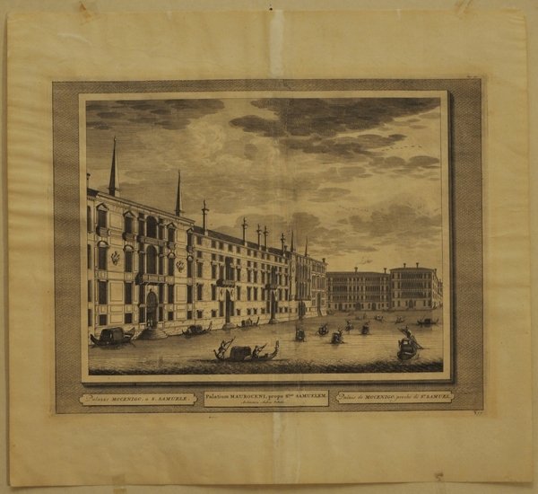 Acquaforte e bulino di mm 356 x 275 alla battuta. Vergatina olandese. Foglio in discrete condizioni, margini pieni, ma restauro abbastanza evidente al centro, con rinforzo al retro. Filigrana non rilevata. In basso le diciture: "Palazzo Mocenigo, a S. Samuele" "Palatium Mauroceni, prope S.tum Samuelem. Architectura Andreae Palladio" "Palais de Mocenigo, proche de St. Samuel"; in piccolo, in basso a destra "Yyy". Il foglio proviene dalla enciclopedica edizione di Georgius Graevius "Thesaurus antiquitatum et historiarum Italiane", Leida 1704 - 1723 illustrante l'intera penisola italiana, nel tomo V dell'opera in 30 volumi, stampato da Peter Van Der AA nel 1722. Normalmente i differenti incisori dell'opera trassero spunto dalla vasta riproduzione iconografica del Carlevarijs. Johann Georg Graevius (correttamente Guava o Greffe) (29 Gennaio, 1632 - 11 Gennaio, 1703) fu uno studioso tedesco nato a Naumburg. Orientato verso studi giurisprudenziali mutò i suoi interessi verso la filologia dopo l'incontro con Johann Friedrich Gronovius. Durante il suo soggiorno ad Amsterdam, sotto l'influenza di Blondel abbandonò il luteranesimo e si unì alla Chiesa riformata, e nel 1656 fu chiamato dal principe elettore di Brandeburgo per la cattedra di retorica nella Università di Duisburg. Nel 1662 si trasferì alla Università di Utrecht, dove occupò la cattedra di retorica, e in aggiunta, dal 1667 fino alla sua morte, anche quella di storia e politica. Venne insignito di un riconoscimento speciale da Louis XIV, ma fu soprattutto apprezzato da Guglielmo III d'Inghilterra, che ne fece lo storiografo reale. Le sue due opere più importanti sono la antiquitatum Thesaurus Romanarum (1694-1699, in 12 volumi), e il Thesaurus antiquitatum et Historiarum Italiae pubblicato dopo la sua morte. Peter van der Aa (Leida, 1659 – Leida, agosto 1733) fu uno dei maggiori editori europei del diciassettesimo e diciottessimo secolo, operando circa dal 1682 a Leida insieme ai suoi fratelli. Tradusse, tra le altre opere, anche quelle di Erasmo da Rotterdam, come l'Elogio della follia e pubblicò le raccolte di storia e archeologia di J.G. Graeve e le opere botaniche di Jan Gronov.