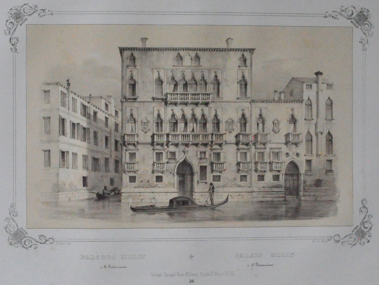 Litografia di 530 x 335 mm su carta di cellulosa. Incisione in cornice con stemmi della famiglia Molin agli angoli. In basso al centro, in italiano e francese: "Palazzo Molin a S. Paterniano - Palais Molin à St. Paterniano". Più sotto "Venise, Joseph Kier Editeur, place S. Marco N° 117" Più sotto: "36". Proveniente da "Venezia monumentale e pittoresca" di Gianjacopo Fontana. Moro Marco (1817-1885): litografo, disegnatore, editore di stampe. Nato a Zenson di Piave (TV), morto a Venezia. 530 x 335 mm lithograph on cellulose paper. Engraving in the frame with the Molin family coats of arms at the corners. Bottom center, in Italian and French: "Palazzo Molin a S. Paterniano - Palais Molin à St. Paterniano". Below "Venise, Joseph Kier Editeur, place S. Marco N ° 117" Below: "36". Coming from "Monumental and picturesque Venice" by Gianjacopo Fontana. Moro Marco (1817-1885): lithographer, draftsman, print publisher. Born in Zenson di Piave (TV), died in Venice.