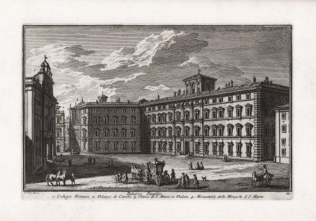 Questa incisione mostra la facciata di Palazzo Doria Pamphili che da su Piazza del Collegio Romano disegnata da Antonio del Grande nel 1660. Nella descrizione in basso Vasi fa riferimento a: 1) Collegio Romano; 2) Palazzo De Carolis; 3) S. Maria in Via Lata; 4) Monastero di S. Marta. Acquaforte, in ottimo stato di conservazione. Veduta tratta dalla monumentale opera ' Delle magnificenze di Roma antica e moderna. Pubblicata in 10 volumi dal 1747 al 1761, l’opera presenta 238 incisioni in rame, ciascuna incisione con testo narrativo che fornisce informazioni storiche e documentarie. ' Conosciuto dai più semplicemente come il "maestro" di Giovanni Battista Piranesi, Giuseppe Vasi rivela in quest'opera monumentale la pienezza della sua creatività grafica. I 10 libri che la compongono hanno ognuno un frontespizio con titolo e data diversi: ' Libro primo che contiene le porte e mura; Libro secondo, che contiene le piazze principali di Roma con obelischi, colonne, ed altri ornamenti; Libro terzo, che contiene le basiliche e chiese antiche di Roma; Libro quarto che contiene i palazzi e le vie più celebri; Libro quinto che contiene i ponti e gli edifizj sul Libro sesto che contiene la chiese parrocchiali; Libro settimo che contiene i conventi e case dei chierici regolari; Libro ottavo che contiene i monasteri e conservatorj di donne; Libro nono che contiene i collegj, spedali, e luoghi pii; decimo che contiene le ville e giardini più rimarchevoli. Le ' Magnificenze ' forniscono un panorama completo e al tempo stesso anticonvenzionale dell'Urbe: così, insieme alle consuete, celeberrime inquadrature desunte dalla migliore tradizione vedutistica, si trova anche una Roma insolita, quella che, talvolta, non esiste più. A quest'opera, di centrale importanza nell'editoria romana di metà Settecento, l'Autore aveva lavorato per quasi un ventennio realizzando una monumentale guida dell'Urbe dove accanto alle consuete e celeberrime inquadrature tratte dalla migliore tradizione vedutistica, immortala anche scorci insoliti che sono poi scomparsi con il cambiare della città. Il testo che accompagna le vedute nel primo volume è opera di Giuseppe Bianchini, nel secondo di Orazio Orlandi e nei restanti del Vasi stesso. Palazzo Panfilio (today Doria Pamphilj) is made up of three adjoining buildings. In this 1754 etching Giuseppe Vasi showed the façade designed by Antonio del Grande in 1660 for that in Piazza del Collegio Romano. The other façades are shown in other two plates - side on Via del Corso and side opposite Palazzo Venezia. In the description below the plate Vasi made reference to: 1) Collegio Romano; 2) Palazzo De Carolis; 3) S. Maria in Via Lata; 4) Monastero di S. Marta. View taken from the monumental work ' Delle magnificenze di Roma antica e moderna. Published in 10 volumes from 1747 to 1761, the work features 238 copper engravings, each engraving with a narrative text that provides historical and documentary information. Known by most simply as the "master" of Giovanni Battista Piranesi, Giuseppe Vasi reveals in this monumental work the fullness of his graphic creativity. The 10 books that compose it each have a title page with a different title and date: ' Libro primo che contiene le porte e mura; Libro secondo, che contiene le piazze principali di Roma con obelischi, colonne, ed altri ornamenti; Libro terzo, che contiene le basiliche e chiese antiche di Roma; Libro quarto che contiene i palazzi e le vie più celebri; Libro quinto che contiene i ponti e gli edifizj sul Libro sesto che contiene la chiese parrocchiali; Libro settimo che contiene i conventi e case dei chierici regolari; Libro ottavo che contiene i monasteri e conservatorj di donne; Libro nono che contiene i collegj, spedali, e luoghi pii; decimo che contiene le ville e giardini più rimarchevoli. ' The ' Magnificences ' provide a complete and at the same time unconventional panorama of the City: thus, together with the usual, celebrated shots taken from the best tradition of ' vedutistica, one also finds an unusual Rome, one that, at times, no longer exists. The author had worked on this work, of central importance in Roman publishing in the middle of the eighteenth century, for almost twenty years, producing a monumental guide to the “Urbe” where, alongside the usual and famous shots taken from the best tradition of ' vedutistica, he also immortalized unusual views that have since disappeared with the change of the city. The text that accompanies the views in the first volume is by Giuseppe Bianchini, in the second by Orazio Orlandi and in the remaining ones by Vasi himself. Cfr. Scalabroni, 146