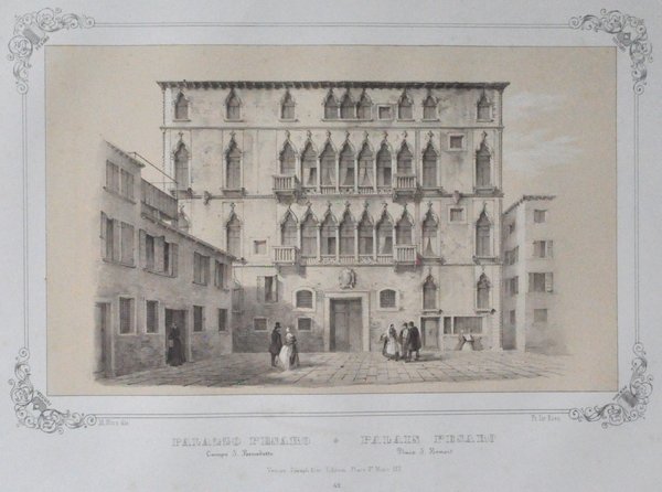 Litografia di 530 x 335 mm su carta di cellulosa. Incisione in cornice con stemmi delle famiglie Correr e Pesaro agli angoli. In basso al centro, in italiano e francese: "Palazzo Pesaro Campo S. Benedetto - Palais Pesaro Place S. Benoit". Più sotto "Venise, Joseph Kier Editeur, place S. Marco N° 117" Più sotto: "42". Proveniente da "Venezia monumentale e pittoresca" di Gianjacopo Fontana. Moro Marco (1817-1885): litografo, disegnatore, editore di stampe. Nato a Zenson di Piave (TV), morto a Venezia. 530 x 335 mm lithograph on cellulose paper. Engraving in the frame with the Correr and Pesaro families coats of arms at the corners. Bottom center, in Italian and French: "Palazzo Pesaro Campo S. Benedetto - Palais Pesaro Place S. Benoit". Below "Venise, Joseph Kier Editeur, place S. Marco N ° 117" Below: "42". Coming from "Monumental and picturesque Venice" by Gianjacopo Fontana. Moro Marco (1817-1885): lithographer, draftsman, print publisher. Born in Zenson di Piave (TV), died in Venice.
