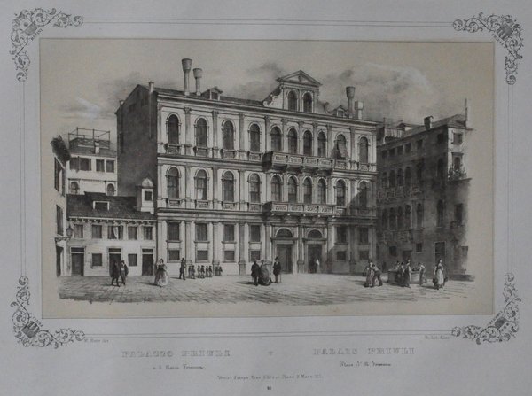 Litografia di 530 x 335 mm su carta di cellulosa. Incisione in cornice con stemmi delle famiglie Priuli e Ruzini agli angoli. In basso al centro, in italiano e francese: "Palazzo Priuli a S. Maria Formosa - Palais Priuli Place St. M. Formosa". Più sotto "Venise, Joseph Kier Editeur, place S. Marco N° 117" Più sotto: "39". Proveniente da "Venezia monumentale e pittoresca" di Gianjacopo Fontana. Moro Marco (1817-1885): litografo, disegnatore, editore di stampe. Nato a Zenson di Piave (TV), morto a Venezia. 530 x 335 mm lithograph on cellulose paper. Engraving in the frame with the Priuli and Ruzini families coats of arms at the corners. Bottom center, in Italian and French: "Palazzo Priuli a S. Maria Formosa - Palais Priuli Place St. M. Formosa". Below "Venise, Joseph Kier Editeur, place S. Marco N ° 117" Below: "39". Coming from "Monumental and picturesque Venice" by Gianjacopo Fontana. Moro Marco (1817-1885): lithographer, draftsman, print publisher. Born in Zenson di Piave (TV), died in Venice.