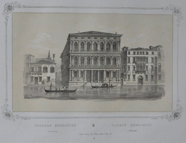 Litografia di 530 x 335 mm su carta di cellulosa in bella acquarellatura. Incisione in cornice con stemmi della famiglia Rezzonico agli angoli. In basso al centro, in italiano e francese: "Palazzo Rezzonico a S. Barnaba - Palais Rezzonico à St Barnabè". Più sotto "Venise, Joseph Kier Editeur, place S. Marco N° 117" Più sotto: "9". Proveniente da "Venezia monumentale e pittoresca" di Gianjacopo Fontana. Moro Marco (1817-1885): litografo, disegnatore, editore di stampe. Nato a Zenson di Piave (TV), morto a Venezia. 530 x 335 mm lithograph on cellulose paper. Engraving in the frame with the Rezzonico family coats of arms at the corners. Bottom center, in Italian and French: "Palazzo Rezzonico a S. Barnaba - Palais Rezzonico à St Barnabè". Below "Venise, Joseph Kier Editeur, place S. Marco N ° 117" Below: "9". Coming from "Monumental and picturesque Venice" by Gianjacopo Fontana. Moro Marco (1817-1885): lithographer, draftsman, print publisher. Born in Zenson di Piave (TV), died in Venice.