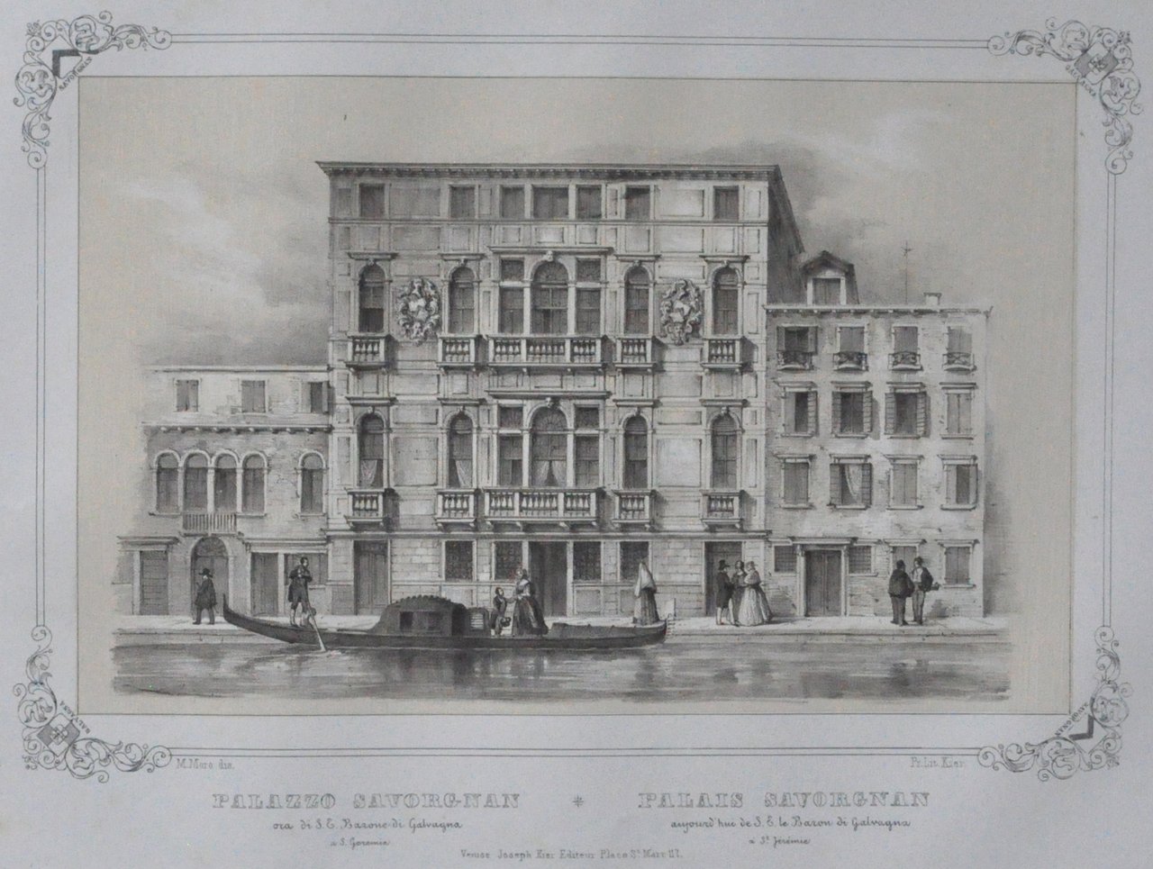 Litografia di 530 x 335 mm su carta di cellulosa. Incisione in cornice con stemmi delle famiglie Savorgnan e Galvagna agli angoli. In basso al centro, in italiano e francese: "Palazzo Savorgnan ora di S.E. Barone di Galvagna a S. Geremia - Palais Savorgnan aujourd'hui de S.E. le Baron di Galvagna à St. Jeremie". Più sotto "Venise, Joseph Kier Editeur, place S. Marco N° 117" Più sotto: "41". Proveniente da "Venezia monumentale e pittoresca" di Gianjacopo Fontana. Moro Marco (1817-1885): litografo, disegnatore, editore di stampe. Nato a Zenson di Piave (TV), morto a Venezia. 530 x 335 mm lithograph on cellulose paper. Engraving in the frame with the Savorgnan and Galvagna families coats of arms at the corners. Bottom center, in Italian and French: "Palazzo Molin a S. Paterniano - Palais Molin à St. Paterniano". Below "Venise, Joseph Kier Editeur, place S. Marco N ° 117" Below: "41". Coming from "Monumental and picturesque Venice" by Gianjacopo Fontana. Moro Marco (1817-1885): lithographer, draftsman, print publisher. Born in Zenson di Piave (TV), died in Venice.