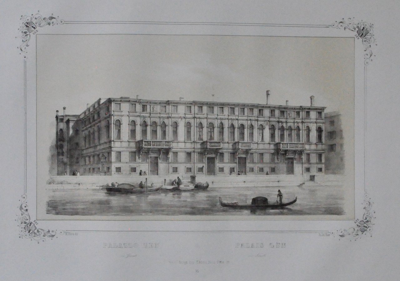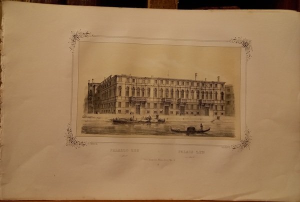 Litografia di 530 x 335 mm su carta di cellulosa. Incisione in cornice con stemmi della famiglia Zen agli angoli. In basso al centro, in italiano e francese: "Palazzo Zen ai Gesuiti; Palais Zen aux Gesuites". Più in basso "a S. Eustachio a St Eustache". Più sotto "Venise, Joseph Kier Editeur, place S. Marco N° 117" Più sotto: "55". Proveniente da "Venezia monumentale e pittoresca" di Gianjacopo Fontana . Moro Marco (1817-1885): litografo, disegnatore, editore di stampe. Nato a Zenson di Piave (TV), morto a Venezia. 530 x 335 mm lithograph on cellulose paper. Engraving in the frame with the Zen family coats of arms at the corners. Bottom center, in Italian and French: "Palazzo Zen ai Gesuiti; Palais Zen aux Gesuites". Further down "a S. Eustachio a St Eustache". Below "Venise, Joseph Kier Editeur, place S. Marco N ° 117" Below: "55". Coming from "Monumental and picturesque Venice" by Gianjacopo Fontana. Moro Marco (1817-1885): lithographer, draftsman, print publisher. Born in Zenson di Piave (TV), died in Venice.