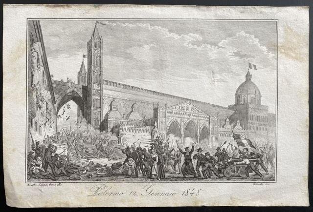 1850 circa. Incisione in rame, b/n, cm 16,5 x 25 (il foglio), in basso a sn. " Niccola Sanesi inv. e dis.", in basso a ds. "G. Scotto inc.". Con il disegno di Niccola Sanesi e l'incisione di G. Scotto, veduta della cattedrale di Palermo durante l'insurrezione del 12 gennaio 1848. I moti siciliani, scoppiati il 12 gennaio del 1848, scaturirono dalla opposizione alla politica assolutistica di Ferdinando II e dalle istanze separatistiche che serpeggiavano nell’isola. Questa rivolta scatenerà i successivi eventi rivoluzionari nella penisola. Il 12 gennaio 1848, giorno del 38esimo compleanno di re Ferdinando, a Palermo scoppia la preannunciata insurrezione. I cospiratori si spargono nei quartieri della città incitando la popolazione alla rivolta e loro appelli non restano inascoltati: gruppi di dimostranti si riversano nelle vie e nelle piazze ingaggiando scontri con la polizia e con i soldati, la ribellione prende corpo e le file degli insorti ingrossano grazie all’afflusso di contadini provenienti dall’entroterra. Armati alla meglio, i ribelli impegnano le forze regie in un’aspra guerriglia urbana, costringendole ad asserragliarsi nei principali uffici pubblici in attesa dei rinforzi che si aspettano da Napoli. Girolamo Scotto (1787 - 1878); Niccola (O Nicola Sanesi (1818 -1889). Usuale patina del tempo, discreto stato. .