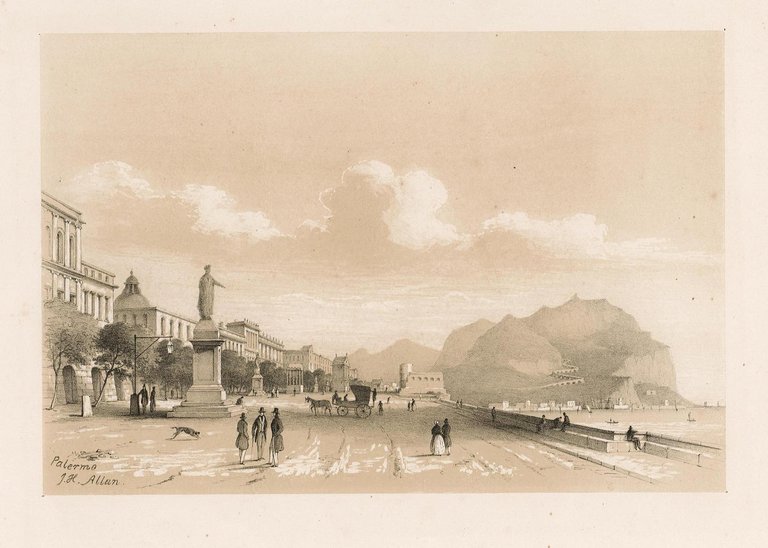 Litografia, antica ed originale, raffigurante la veduta del lungo mare di Palermo. Autore: Allan John H. dis. Luogo: Palermo. Anno: 1843. Tecnica: litografia su fondino seppia. Dimensioni: 190x283. Tratta dall'opera "A pictorial tour in the Mediterranean" by John H. Allan. Pubblicata a Londra da Longman, brown, Green, and Logmans