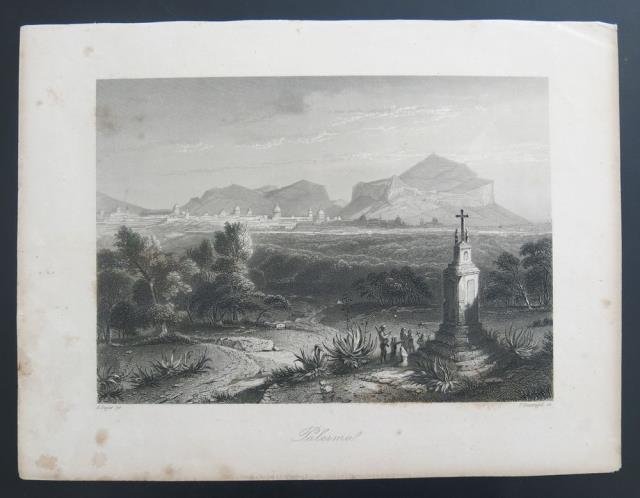 1860 circa. Incisione su acciaio, b/n, cm 14,8 x 20,7 (la parte figurata) più margini. Veduta panoramica, sullo sfondo la città di Palermo. Marginali macchiette di umido.