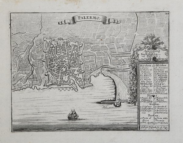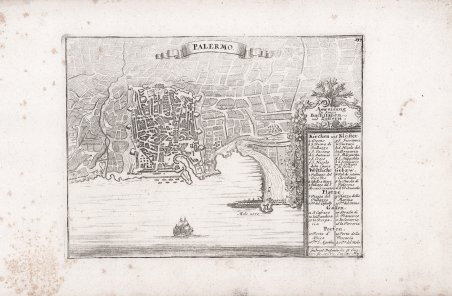 Tratta da "Atlas Curieux oder Neuer und Compendieuser Atlas : in welchem ausser den General-Land-Charten von America, Africa, Asia und Europa, und der in letzterem gelegenen Reichen und Landern, sehr viele Speciale von besondern Provincien und Territorien, sonderlich deren, die in letzteren Kriegen renommiert worden, enthalten sind. Herausgegeben und verlegt von Gabriel Bodenehr, Kupfferstecher in Augspurg"del Bodenher. SI tratta dell'opera principale di Gabriel Bodenehr, icartografo tedesco di una famosa famiglia di incisori e editori ad Augusta. Include 101 mappe incisei, con 4 carte del mondo rappresentato con emisfero doppio, la mappa idrografica, le mappe dei continenti, le prime quattro mappe relative all'America, e mappe dettagliate dell'Europa e dei paesi europei. Alcune mappe, recano il solo titolo in latino.Incisione in rame, in ottimo stato di conservazione. Taken from the "Atlas Curieux oder Neuer und Compendieuser Atlas : in welchem ausser den General-Land-Charten von America, Africa, Asia und Europa, und der in letzterem gelegenen Reichen und Landern, sehr viele Speciale von besondern Provincien und Territorien, sonderlich deren, die in letzteren Kriegen renommiert worden, enthalten sind. Herausgegeben und verlegt von Gabriel Bodenehr, Kupfferstecher in Augspurg" by Bodenher.This atlas is the main work of Gabriel Bodenehr a German cartographer from a renowned engraver and publisher family in Augsburg. Includes 101 engraved folded plates listed in contents, with 4 double hemisphere world maps, hydrographic map, maps of continents, the first four maps relate to America, detailed maps of Europe and European countries. Many maps with decorative title cartouche. Some maps are in Latin.Copper engraving, in excellent condition. Cfr. C. Barbera Azzarello, "Raffigurazioni ricostruzioni vedute e piante di Palermo", sch. e tav. 53