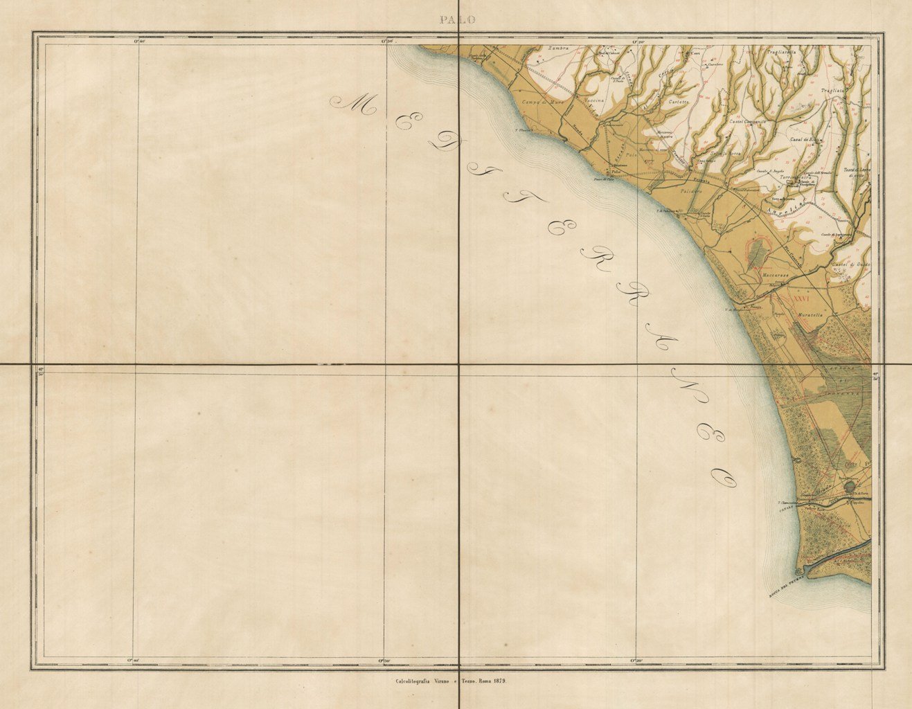 Foglio nr 4 della "Carta topografica dell'Agro Romano e territori limitrofi in scala 1 a 80.000" contenente il territorio di Palo con parte della costa che dal canale della Turbara arriva fino a Fiumicino e Bocca del Tevere. La tinta di color ocra distingue le vallicelle e le parti basse della Campagna Romana