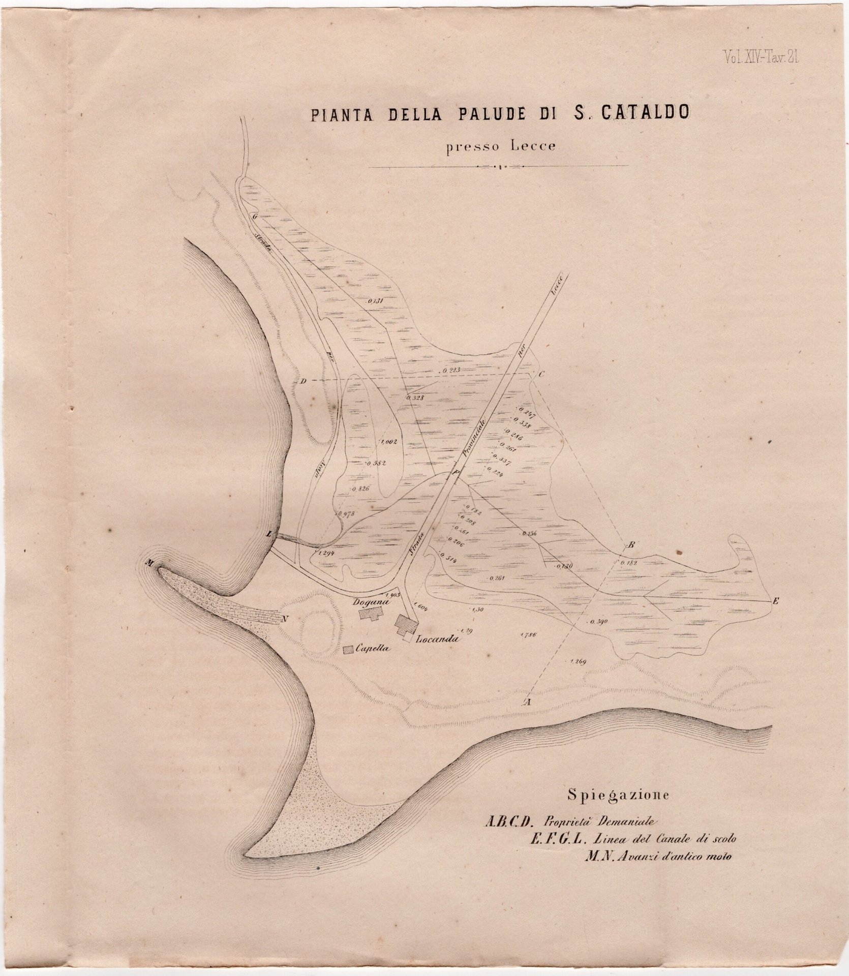 Pianta della palude di San Cataldo (Lecce) cm. 26,5 x 23 parte incisa 22 x 20 , alcune lievi fioriture e segni del tempo.