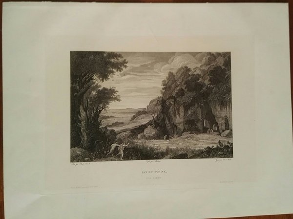 Bellissima incisione originale in bianco e nero presa dal Musèe du Louvre. Dimensioni 47 x 62 cm. Buono stato.Ovidio narra che, Pan, figlio di Ermes si innamorò di Siringa, ninfa seguace di Diana. La ninfa, per sfuggire a Pan, scappò nei pressi di una palude fino alla sponda del fiume Ladone, dove, vedendosi raggiunta, invocò le Naiadi che la mutarono in canne palustri. Pan, nel momento in cui pensava di aver raggiunto la ninfa, si trovò davanti ad un fascio di canne che, mosse da vento, mandavano un suono delicato. Allora il dio utilizzò le canne per costruire uno strumento musicale: la siringa.