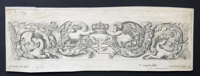 Incisione in rame all’acquaforte, 1646 / 1648 circa, b/n, cm 7,8 x 24,2 (alla lastra), firmata e datata in lastra, in bs. a sn. “S. D. Bella inv. & fec.”, spostato sulla ds. “N. Langlois fils”, a ds. “Cum Privil. Regis 3” Probabile III stato / VI con l’indirizzo “N. Langlois (Parigi 1640 – 1703), impressa su carta databile alla metà del XVII secolo. Tavola numero 3 della serie “Ornamenti di fregi e fogliami”, composta da sedici stampe. Al centro del foglio una L maiuscola, l’iniziale di re Luigi XIV, sormontata da una corona sostenuta da due cherubini, colti entrambi di profilo, e che sembrano uscire da volute di fogliame che si sviluppa in orizzontale per tutta la composizione terminando su ciascun lato con la figura di una arpia. (Bibliografia: De Vesme - Massar 989, p. 215). Con strettissimo e irregolare margine intorno l’impronta del rame, buona impressione. .