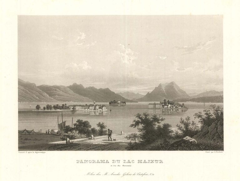 Raffinata veduta dell'Isole Borromee ritratta dalla strada che porta a Stresa. Sulla sinistra si riconosce l'Isola Bella, al centro l'Isola Superiore o dei Pescatori, mentre in lontananza si scorge l'Isola Madre. Ottimo lo stato di conervazione generale