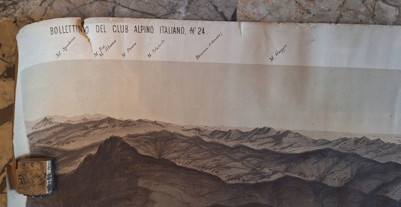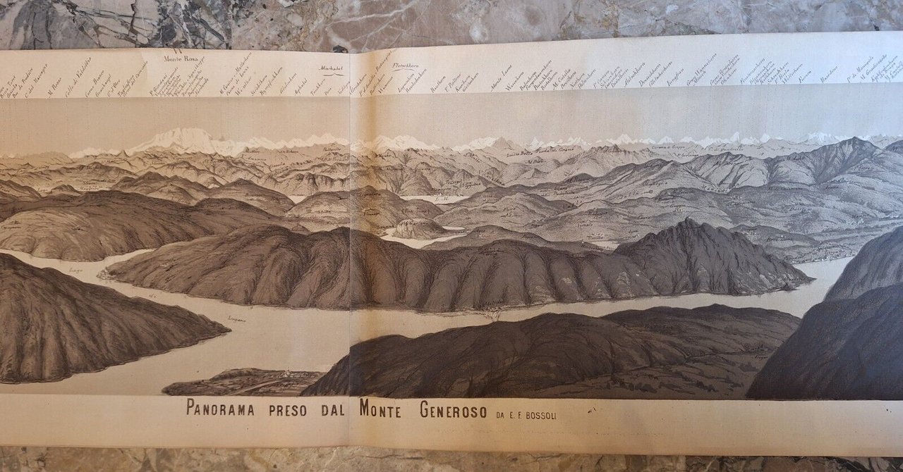 PANORAMA PRESO DAL MONTE GENEROSO E. F. BOSSOLI DAL BOLLETTINO DEL CAI N. 24 Mappa panoramica di cm. 23 x 243, a colori.Tenui macchie al margine destro , piccolissimi strappi al margine inferiore e superiore.