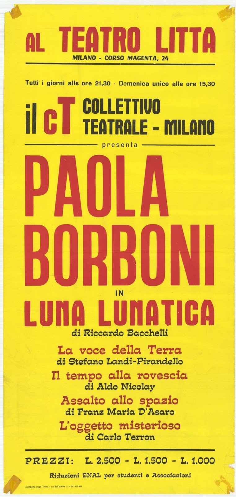 Locandina originale, Paola Borboni al Teatro Litta, Milano. Pieghe e leggera usura ai margini