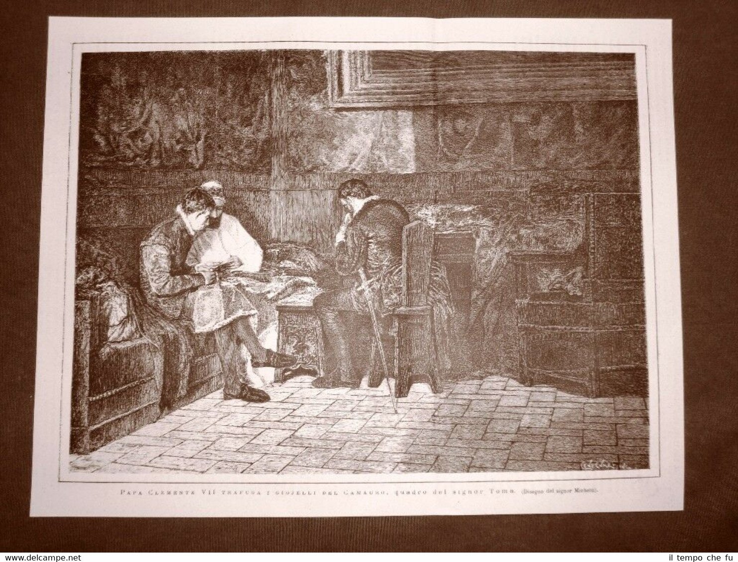 Rara incisione estratta da pubblicazione del 1875. .incisione che ha quindi oltre 142 anni! Papa Clemente VII trafuga i gioielli del Camauro Quadro del Sig. Toma II1875-036 Dimensioni Cm 32,00 x 25,00 Qualora vogliate delle scansioni migliori contattateci, soddisferemo ogni vostra richiesta. Paypal Carta di credito Bonifico bancario Accuratamente adagiate su un cartoncino e protette da pellicola trasparente rigida, il tutto viene inserito dentro plico di adeguate dimensioni per proteggerne l'integrità.