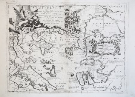 Carta marittima di grande impatto dell'Egeo settentrionale e del Bosforo del 1696. Sono presenti il Mare di Tracia e il Mare di Marmora, con Costantinopoli in primo piano. Un gigantesco cartiglio allegorico domina la composizione, descrivendo la guerra di Morea tra la Repubblica di Venezia e l'Impero Ottomano. Opera tratta dall’Isolario dell’Atlante Veneto del P. Coronelli, In Venetia MDCXCVI. Coronelli visse un periodo di straordinaria fecondità editoriale a partire dal 1689, quando ebbe la cattedra di geografia presso l'Università alle Procuratie, con la pubblicazione, nel 1690, del primo volume dell'Atlante Veneto. In effetti sotto il nome di ' Atlante Veneto ' va tutta la raccolta di tredici opere composte nell'arco del decennio successivo, dall'Isolario ' allo ' Specchio del mare. L'Isolario ' mira, con una barocca e minuziosa ricerca del dettaglio, alla celebrazione dei possedimenti della Serenissima. Monumentale raccolta di carte e vedute di isole, rappresenta l'ultimo degli “isolari” concepiti, che, tra la fine del XVII e l'inizio del XVIII secolo, vennero progressivamente soppiantati dagli atlanti di moderna concezione, opere a stampa caratterizzate da crescente precisione scientifica e da sempre minore pregio artistico. Sulla scia delle nuove conquiste coloniali le rappresentazioni cartografiche vennero ad assumere un carattere sempre più tecnico, fino ad allora piuttosto arbitrario. Incisione in rame, restauri alla piega centrale visibili al verso, per il resto in ottimo stato di conservazione. Striking sea chart of the Northern Aegean and the Bosporus from 1696. The Sea of Thrace and the Sea of Marmora are featured and Constantinople is prominently noted. Giant allegorical cartouche dominates the composition, describing the Morean war between between the Republic of Venice and the Ottoman Empire. ' The map is taken from ' Isolario dell’Atlante Veneto del P. Coronelli, In Venetia MDCXCVI. Coronelli lived a period of extraordinary editorial fecundity starting from 1689, when he had the chair of geography at the University at the Procuratie, with the publication, in 1690, of the first volume of the ' Atlante Veneto. Under the name of ' Atlante Veneto ' goes the entire collection of thirteen works composed over the next decade, from the ' Isolario ' to the ' Specchio del mare. The ' Isolario ' aims, with a baroque and meticulous search for detail, to celebrate the possessions of the Serenissima. Monumental collection of maps and views of islands, represents the last of the "isolarios" conceived, which, between the end of the seventeenth and the beginning of the eighteenth century, were gradually supplanted by modern atlases, printed works characterized by increasing scientific precision and less and less artistic value. In the wake of the new colonial conquests, cartographic representations came to assume an increasingly technical character, until then rather arbitrary. Copperplate, some expert repairs at the middle fold, otherwise good conditions. Cfr.
