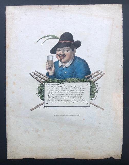Paris, Chez P. Marino Editeur, 1850 circa. Litografia in colore d'epoca, cm 26,5 x 35 (il foglio). Litografato dal Levilly e impresso dal Ducarme, entrambi noti nomi della calcografia parigina della metà del XIX secolo, simpatico soggetto che pubblicizza un vino o un liquore definito come "nectar delicieux". Alcune imperfezioni del tempo, intensa e piacevole coloritura, nell'insieme in buono stato di conservazione. .