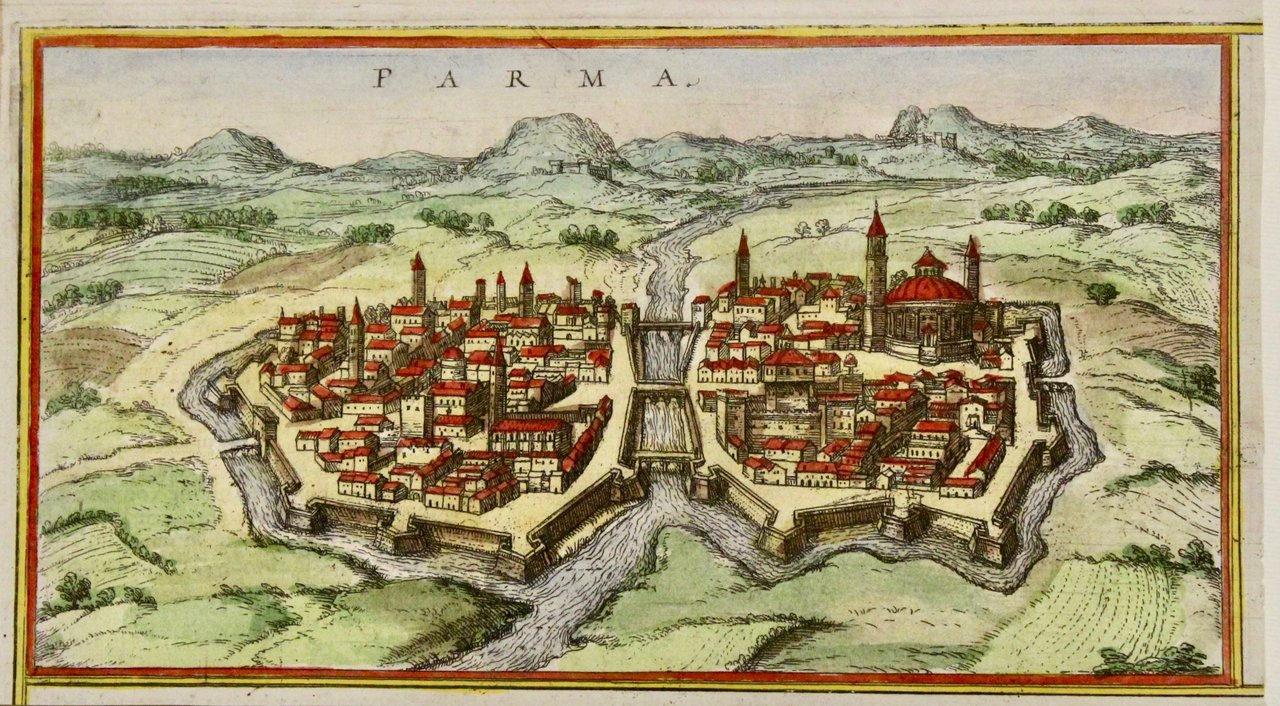 Incisione in rame, mm 125x230, dipinta a mano. Bell’esemplare di questa bella e celeberrima veduta a volo d’uccello della città. Tratta da “Civitates Orbis Terrarum”, pietra miliare del vedutismo, stampata dal 1572 al 1617 in 6 volumi pubblicati in anni differenti in varie lingue, compilata e scritta da Georg Braun, mentre Frans Hogenberg fu autore delle incisioni insieme a Simon Novellanus, generalmente da soggetti di Georg Hoefnagel. Ottimo esemplare. Due margini rifilati come sempre.