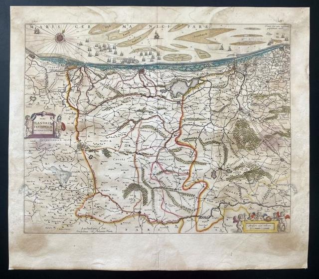 1630 circa. Dal “Theatrum Orbis Terrarum”, incisione in rame, confini e cartiglio in colore, cm 39,8 x 50,3 circa (alla lastra) più margini. Edizione francese con testo al verso. La regione fiamminga del Belgio, le Fiandre, è una zona di lingua olandese, situata nel nord del Paese, ed è una delle tre regioni belghe. Foglio con difetti e arrossamenti lungo le aree laterali e agli angoli ma a pieni margini e buono l'inciso.