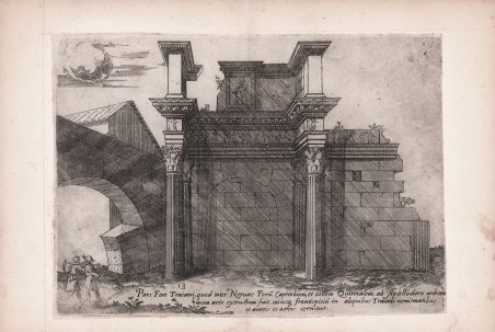 Veduta tratta da "Urbis Romae aedificiorum illustriumquae […] supersunt reliquiae summa cum diligentia a Joanne Antonio Dosio stilo ferreo ut hodie cernuntur descriptae et a Jo Baptista de Cavaleriis aeneis tabulis incisis repraesentatae", la nota raccolta di antichi edifici romani pubblicata dal Cavalieri nel 1569 da disegni dell'architetto e scultore Giovanni Antonio Dosio. Incisione su rame, impressa su di un foglio di carta vergata coeva, rifilato ai margini e applicato su un un secondo foglio di carta vergata, in buono stato di conservazione. View taken from "Urbis Romae aedificiorum illustriumquae [.] supersunt reliquiae summa cum diligentia a Joanne Antonio Dosio stilo ferreo ut hodie cernuntur descriptae et a Jo Baptista de Cavaleriis aeneis tabulis incisis repraesentatae," the well-known collection of ancient Roman buildings published by Cavalieri in 1569 from drawings by architect and sculptor Giovanni Antonio Dosio. Copperplate engraving, printed on a contemporary laid paper, trimmed at the margins and applied to a second paper sheet, light waterstain, otherwise in good condition. Cfr.
