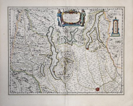 Carta geografica inserita nell'Atlas Major ' del Blaeu.Dal punto di vista cartografico la mappa deriva dalla carta del Magini già ripresa in Olanda da Jodocus Hondius. Willem Janszoon Blaeu, avviò nel 1599 la sua attività di costruttore di globi e strumenti astronomici ad Amsterdam. Nel 1630, dopo aver comprato alcune lastre dell’atlante del Mercator da Jodocus Hondius II, fu in grado di pubblicare un volume di 60 mappe con il titolo di ' Atlantis Appendix. Cinque anni dopo, pubblicò i primi due volumi del suo atlante ' Atlas Novus ' o ' Theatrum Orbis Terrarum, ' in sei libri. Dopo la sua morte, Joan (Johannes) continuò l’opera paterna, completando l’intera serie di sei volume dell’Atlas Novus ' intorno al 1655. Fu inoltre autore di un ' Atlas Maior sive Cosmographia Blaviana, in 12 volumi pubblicati nel 1662 -72, dei quali uno dedicato all'Italia. La carta compare per la prima volta nel terzo volume del ' Theatrum. ' Secondo Koeman viene pubblicata in primis nell'edizione francese del 1640, dal titolo ' Le Theatre du Monde ou Nouvel Atlas, ' Mis en lumiere par Guillaume & Jean Blaeu. ' Troisieme partie. A Amsterdam, Chez Iean & Corneille Blaeu MDCXL. Il terzo volume del ' Theatrum ' contiene 58 carte dell'Italia e 4 della Grecia (cfr. Koeman, ' Atlas Neerlandici, pp. 160-162, Bl 35A). Le carte dell'italia derivano tutte dall'opera di Giovanni Antonio Magini. Tuttavia, sembra più probabile che il Blaeu si basi sue quelle di Hendrick Hondius e Johannes Janssonius pubblicate nel ' Theatrum Italiae in quo Eius Regna, Domina, Ducatus, Et Speciatim Illorum Provinciae, Tabulis Accuratissimis, Iam, De Novo in Lucem Editio, Describunter, Quorum Sequens Pagina Indicabit, stampato ad Amsterdam da Hendrick Hondius nel 1636. ' Sebbene pubblicate dopo la morte di Willem Janszoon Blaeu (1638) le carte spesso recano il suo imprint. Non è dato sapere se fossero tutte già pronte o se i figli Johannes e Cornelis le compilarono postume. Incisione in rame, magnifica coloritura coeva, in ottimo stato di conservazione. Striking example of Blaeu's decorative map of Lombardia after Giovanni Antonio Magini. Willem Janszoon Blaeu, started in 1599 his business as a builder of globes and astronomical instruments in Amsterdam. In 1630, after buying some plates of the Mercator atlas from Jodocus Hondius II, he was able to publish a volume of 60 maps under the title ' Atlantis Appendix. Five years later, he published the first two volumes of his atlas ' Atlas Novus ' or ' Theatrum Orbis Terrarum, in six books. After his death, Joan (Johannes) continued his father's work, completing the entire six-volume ' Atlas Novus ' series around 1655. He was also the author of an ' Atlas Maior sive Cosmographia Blaviana, in 12 volumes published in 1662 -72, one of which was devoted to Italy. The map first appears in the third volume of the ' Theatrum. According to Koeman it is first published in the French edition of 1640, entitled ' Le Theatre du Monde ou Nouvel Atlas, Mis en lumiere par Guillaume & Jean Blaeu. Troisieme partie. In Amsterdam, Chez Iean & Corneille Blaeu MDCXL. The third volume of the ' Theatrum ' contains 58 maps of Italy and 4 of Greece (see Koeman, ' Atlas Neerlandici, pp. 160-162, Bl 35A). The maps of Italy are all derived from the work of Giovanni Antonio Magini. However, it seems more likely that Blaeu relies on those of Hendrick Hondius and Johannes Janssonius published in ' Theatrum Italiae in quo Eius Regna, Domina, Ducatus, Et Speciatim Illorum Provinciae, Tabulis Accuratissimis, Iam, De Novo in Lucem Editio, Describunter, Quorum Sequens Pagina Indicabit, ' printed in Amsterdam by Hendrick Hondius in 1636. Although published after the death of Willem Janszoon Blaeu (1638) the maps often bear his imprint. It is not known whether they were all ready-made or if his sons Johannes and Cornelis completed them posthumously. Copperplate, with fine original colouring, in very good conditions. Cfr.