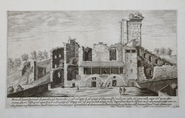 Veduta tratta dalla serie "Vestigi delle Antichità di Roma Tivoli Pozzuolo et altri luoghi", che il Sadeler incide, riprendendole dalla serie del francese Stefano Du Pérac, con la tecnica del bulino e in formato ridotto.L'opera consta di 50 tavole pubblicate da Marco Sadeler nel 1606 a Praga, attivissimo centro culturale, con lo stesso titolo "Vestigi delle Antichità di Roma" e le medesime descrizioni del Du Pérac in lingua italiana, senza citare l'inventore.Incisore di corte presso Rodolfo II, il Sadeler aveva compiuto viaggi in Germania e in Italia, soggiornando a Roma nel 1593.Nella sua opera compaiono però anche vedute di ". Tivoli, Pozzuolo et altri luochi" che mancano in quella del Du Pérac (sono tredici le tavole nuove) nelle quali viene accentuato l'aspetto naturalistico.Bulino, impresso su carta vergata coeva, con margini, perfetto stato di conservazione. View taken from "Vestigi delle Antichità di Roma Tivoli Pozzuolo et altri luoghi", after Etienne Duperac.Lettered in lower margin, with publisher's address and with Italian key to letters from within composition: "Marco Sadeler excudit.".Engraving, 1606, second state with publisher's address. The work consists of 50 plates first published by Marco Sadeler in 1606 in Prague with the same title and the same descriptions of Du Pérac in Italian. After taht the plates are re issued in Rome by Domenico De'Rossi. Engraver at the court of Rudolf II, Sadeler had made trips to Germany and Italy, staying in Rome in 1593. In his work appear but also views of Tivoli and Pozzuoli lmissing in that of Du Pérac (are thirteen new plates) in which is emphasized naturalistic. A fine impression, printed on contemporary laid paper, with margins, good condition. Cfr.