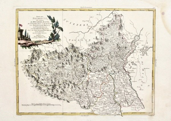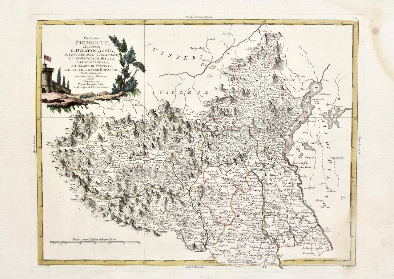 Incisione in rame, colori d'epoca, mm 325x415. Buon esemplare in fascinosa forte coloritura, con ampi margini. Aloni al margine destro che in basso intaccano leggermente l'inciso.<BR>Antonio Zatta (1775-1797) fu uno dei più importanti editori di carte geografiche del tardo XVIII secolo italiano. La sua opera costituisce un importante punto di passaggio tra la cartografia antica e moderna, più attenta all'accuratezza dei dettagli geografici che all'abbellimento estetico ricco di motivi mitologici o d'invenzione, come era quello dell'epoca precedente. La sua opera più importante è Atlante novissimo pubblicato tra il 1775 e il 1789, da cui è tratta la carta.