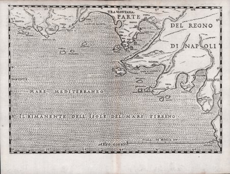 Carta geografica tratta dal ' Descrittione di tutta Italia ' di Leandro Alberti, stampato per la prima volta nel 1561. L’opera offre numerose notizie di carattere geografico-storico-etnologico ed è arricchita dalle carte geografiche per la prima volta nel 1568. Si tratta della più importante guida di viaggio in Italia della prima età moderna, contenente ampie informazioni su corografia, storia, etnografia e cultura artistica. La seconda parte contiene la ' Descrittione di tutte le isole ' e l'aggiunta della descrizione di Venezia ed è illustrata da 7 carte geografiche intagliate in legno. Le due parti furono pubblicate insieme o separatamente. Leandro Alberti (1479-1552) era uno studioso domenicano di Bologna, conoscitore di Achille Bocchi e Andrea Alciato. Scrisse numerose storie, servendo l'Inquisizione come censore e poi inquisitore ufficiale dal 1550 alla sua morte. Fu noto soprattutto per la sua attività contro la stregoneria. La ' Descrittione ' riassume i suoi lunghi viaggi (1525-1528) attraverso la penisola italiana con il generale dell'Ordine domenicano Francesco Silvestro da Ferrara per visitare i conventi domenicani e fu poi usata come modello dai cartografi olandesi, come Abraham Ortelius. L'opera comprende capitoli su 18 delle 19 regioni d'Italia, fornendo informazioni su paesaggio, costumi, personaggi importanti, antichità e monumenti, specialmente fortificazioni e chiese. Una lunga introduzione dettaglia le risorse naturali dell'Italia, la sua favorevole posizione geografica e il clima, così come la topografia e i confini, le origini del suo nome e i primi insediamenti tra Lazio e Toscana. Ogni capitolo si concentra su una regione diversa e comprende excursus etimologici e storici, con riferimenti a figure eroiche e rappresentanti del mondo della cultura. I capitoli più significativi ed estesi riguardano le città di Roma, la sua fondazione e il suo governo, i luoghi di rilevanza storica e i resti archeologici; e Firenze, notevole per la sua storia e patria di gloriosi sovrani, studiosi e artisti. Il resoconto delle province meridionali d'Italia costituisce una novità in quanto l'Alberti fu uno dei primi viaggiatori a descrivere le zone di Terra di Lavoro e della Puglia, registrando il nome dei luoghi nei dialetti, la natura e i luoghi di pellegrinaggio come il Santuario dell'Arcangelo Michele nella grotta sul Monte Gargano. L'opera si ispira principalmente all'Italia illustrata ' di Flavio Biondo, ma Alberti non si attiene completamente al suo schema, raccogliendo informazioni di prima mano e utilizzando nuove fonti come storie locali e mappe, oltre ad altri autori della prima età moderna. Xilografia, impressa su carta vergata coeva, ottima impressione con margini, perfette condizioni. Map taken from the ' Descrittione di tutta Italia ' by Leandro Alberti, printed for the first time in 1561. The work offers numerous news of geographic-historical-ethnological character and is enriched by maps for the first time in 1568. The book is the most important early modern travel guide to Italy, containing extensive information on chorography, history, ethnography and artistic culture, published without part 2 containing the ' Descrittione di tutte le isole ' and the added description of Venice. The two parts were issued together or separately. Leandro Alberti (1479-1552) was a Dominican scholar from Bologna, acquainted with Achille Bocchi and Andrea Alciato. He wrote numerous histories, serving the Inquisition as censor and then official inquisitor from 1550 to his death. He was mostly known for his anti-witchcraft activity. The Descrittione summarised his long travels (1525-1528) across the length of the Italian peninsula with the Dominican Order s General Francesco Silvestro da Ferrara to visit Dominican convents and was later used as a model by the Dutch cartographers, such as Abraham Ortelius. The account of the Southern provinces of Italy constitute a novelty since Alberti was one the first travellers who described the areas of Terra di Lavoro and Puglia, recording places name in dialects, nature and pilgrimage sites such as the Sanctuary of the Archangel Michael in the cave on Mount Gargano. The work was mainly inspired by Flavio Biondo s Italia illustrata but Alberti did not adhere to its pattern completely, collecting first-hand information and using new sources such as local histories and maps, as well as other early modern authors. Woodcut, printed on contemporary laid paper, very good condition. Cfr.