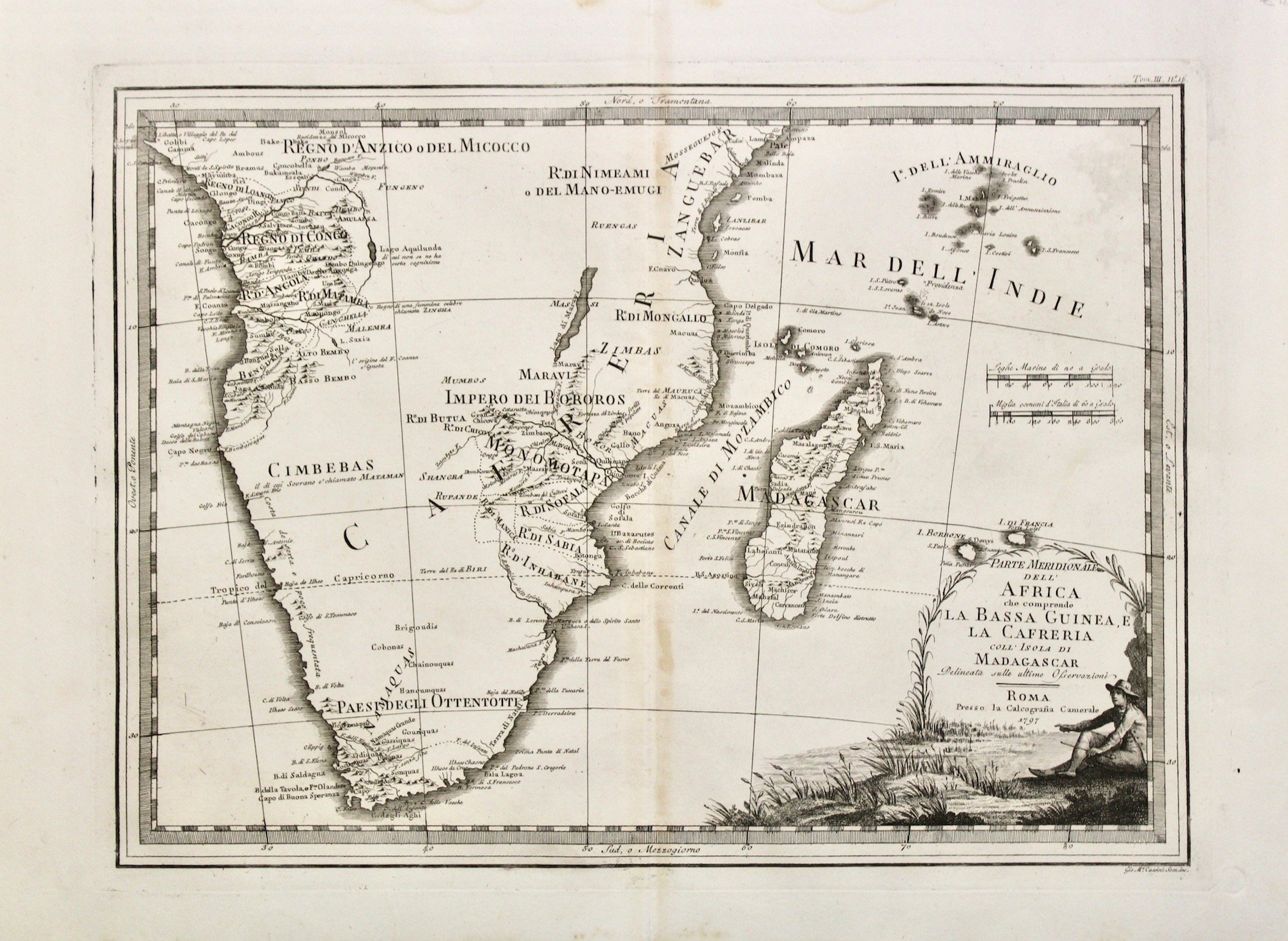 Incisione in rame, mm 345x475. Non comune carta dell'Africa centro meridionale. Ottimo esemplare marginoso con lievissimo alone centrale. Tratta dal "Nuovo Atlante Geografico Universale delineato sulle ultime osservazioni", edito a Roma dal 1792 fino al 1801. La Calcografia Camerale gli commissionò l'opera per sostituire il "Mercurio Geografico". Giovanni Maria Cassini (1745-1824), allievo di Piranesi, fu religioso, geografo, costruttore di globi e cartografo. <BR>Copper engraving, mm 345x475. Scarce map of southern Africa. From "Nuovo Atlante Geografico Universale delineato sulle ultime osservazioni", printed in Rome form 1792 to 1801. Very good conditon, just a very light paper discoloration at centerfold <BR>