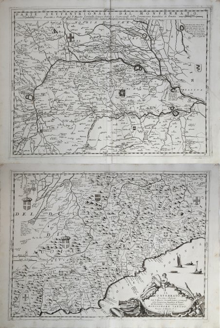 Importante carta geografica raffigurante il Monferrato settentrionale e meridionale. Numerosi stemmi inseriti sulle campiture. Lungo tutto il lato superiore il titolo, la dedica a Monsignor Sanudo Vescovo di Treviso e le scale metriche. In basso a destra entro grande e ricco cartiglio circondato da vascelli e sormontato da putti con festoni e trofei, il titolo. Opera tratta dal ' Corso geografico universale, o sia la terra divisa nelle sue parti e subdistinta ne' suoi gran regni. Esposta in tavole geografiche ricorrette et accresciute di tutte le nuove scoperte, ad uso dell'Accademia Cosmografica degli Argonauti dal Padre Maestro Vincenzo Coronelli M. C. Cosmografo della Serenissima Republica di Venetia. Dedicata alla Santità di Nostro Signore Innocenzo XII. P. I. In Venetia, a spese dell'autore. MDCXCII. Coronelli visse un periodo di straordinaria fecondità editoriale a partire dal 1689, quando ebbe la cattedra di geografia presso l'Università alle Procuratie, con la pubblicazione, nel 1690, del primo volume dell'Atlante Veneto. In effetti sotto il nome di ' Atlante Veneto ' va tutta la raccolta di tredici opere composte nell'arco del decennio successivo, dall'Isolario ' allo ' Specchio del mare. In realtà solo alcune di tali opere possono definirsi atlante, e sono di valore molto disuguale, dato che si passa da opere originali e fondamentali come quelle citate o il ' Corso Geografico ' ad opere di compilazione o semplici raccolte di vedute. Il ' Corso Geografico ' uscì in diverse edizioni con numeri diversi di carte - sessantotto tavole nel 1689-92; di centosettantatré tavole nel 1692; duecentosessanta tavole, nel 1694-97 - che venivano vendute anche separatamente, al ritmo di sei carte al mese per due anni. Le carte furono incise tra il 1688 e il 1692 nell'attrezzatissima officina cartografica del convento dei Frari, dove lavoravano anche incisori stranieri. ' Due fogli da 610x460 mm Important map depicting northern and southern Monferrato. Numerous coats of arms inserted on the backgrounds. Along the entire upper side the title, dedication to Monsignor Sanudo Bishop of Treviso, and metric scales. Bottom right within large, rich cartouche surrounded by vessels and surmounted by putti with festoons and trophies, the title. The map is taken from ' Corso geografico universale, o sia la terra divisa nelle sue parti e subdistinta ne' suoi gran regni. Esposta in tavole geografiche ricorrette et accresciute di tutte le nuove scoperte, ad uso dell'Accademia Cosmografica degli Argonauti dal Padre Maestro Vincenzo Coronelli M. C. Cosmografo della Serenissima Republica di Venetia. Dedicata alla Santità di Nostro Signore Innocenzo XII. P. I. In Venetia, a spese dell'autore. MDCXCII. Coronelli lived a period of extraordinary editorial fecundity starting from 1689, when he had the chair of geography at the University at the Procuratie, with the publication, in 1690, of the first volume of the ' Atlante Veneto. Under the name of ' Atlante Veneto ' goes the entire collection of thirteen works composed over the next decade, from the ' Isolario ' to the ' Specchio del mare. ' In reality, only some of these works can be defined as atlas, and are of very unequal value, since we go from original and fundamental works such as those mentioned or the ' Corso Geografico ' to works of compilation or simple collections of views. The ' Corso Geografico ' came out in several editions with different numbers of maps - sixty-eight maps in 1689-92; one hundred and seventy-three maps in 1692; two hundred and sixty maps in 1694-97 - which were also sold separately, at the rate of six a month for two years. The maps were alle engraved between 1688 and 1692 in the well-equipped cartographic workshop of the Frari convent, where foreign engravers also worked. ' Two sheets ' of 610x460 mm Cfr.