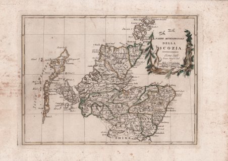 Carta tratta dalla rara raccolta di carte geografiche denominata Atlante Geografico, prima stesura delle opera dell’abate Bartolomeo Borghi, pubblicata in Siena dal Pazzini Carli. Molte delle carte, datate tra il 1788 ed il 1800, sono incise da Agostino Costa e poi successivamente inserite nell’opera Atlante generale dell'ab. Bartolommeo Borghi, pubblicato a Firenze nel 1819.Bartolomeo Borghi, che Vermiglioli (Biografia degli scrittori perugini, 1829) definisce "uno dei migliori geografi dell'Europa", nacque nel 1750 a Monte del Lago, piccola frazione del comune di Magione, in provincia di Perugia, sulle rive del Trasimeno. Ordinato sacerdote nel 1774, trascorse i primi anni del suo mandato nel paese natale, poi a Magione e quindi a Sorbello (Cortona).Appassionato studioso di geografia, applicò dapprima le sue conoscenze all'analisi delle terre a lui più familiari: nel 1770 scrisse Descrizione geografica, fisica e naturale del Lago Trasimeno (che sarà tuttavia data alle stampe per la prima volta solo nel 1821), e nel 1791 pubblicò negli atti dell'Accademia etrusca di Cortona una Dissertazione sopra l'antica geografia dell'Etruria, Umbria e Piceno, arricchendo entrambe le opere di una carta delle regioni descritte. Intanto la sua fama di cartografo, oltre che di geografo, cresceva, tanto da fargli ottenere le nomine a membro delle Accademie Cortonese e Reale di Firenze, e procurargli l'incarico, da parte di Pietro Leopoldo, di delineare la carta del catasto pubblico di Cortona e del contado di Castiglione.Nello stesso tempo gli orizzonti geografici della sua attività si allargavano sensibilmente, e se nell'Atlante Novissimo, illustrato ed accresciuto sulle osservazioni, e scoperte fatte dai più celebri e più recenti cartografi di Antonio Zatta (Venezia 1779-1785) il suo contributo fu ancora legato all'area toscana, nell'Atlante geografico che si pubblicò a Siena da Pazzini Carli tra il 1798 ed il 1800 il Borghi tracciò la maggior parte delle carte e spaziò dalle province del Sud-Est dell'Inghilterra, al Regno di Danimarca, alla Romania.Una sorta di prova generale, quest'ultima, della sua opera più importante, quell'Atlante generale dell'ab. Bartolommeo Borghi, pubblicato a Firenze nel 1819. L'Atlante, corredato da brevi descrizioni storiche, politiche, civili e naturali che introducono le carte relative ai territori afferenti a ciascun Impero o Regno illustrato, rispecchia il nuovo assetto geo-politico attuato dal Congresso di Vienna. Map taken form the very rare Atlante Geografico, the first draft of the abbot Bartolomeo Borghi, published in Siena by Pazzini Carli. Many of the mapss, dated between 1788 and 1800, are engraved by Agostino Costa and then later incorporated in the work of AB Atlante Generale di Bartolomeo Borghi, published in Florence in 1819.Bartolomeo Borghi, who Vermiglioli (Biography of writers Perugini, 1829) calls "one of the best geographers of Europe", was born in 1750 in Monte del Lago, a small fraction of the town of Mansfield, in the province of Perugia, on the shores of Lake Trasimeno. Ordained in 1774, spent the first years of his term in his hometown, then to Mansfield and then Sorbello (Cortona).A passionate student of geography, first applied his knowledge to the analysis of land more familiar to him: he wrote in 1770 Description geographical, physical and natural Lake Trasimeno (which will however be given to the press for the first time only in 1821), and 1791 published in the Proceedings of Etruscan Cortona a dissertation on the geography of ancient Etruria, Umbria and Piceno, enriching both the works of a map of the regions described. Meanwhile, his fame as a cartographer, as well as a geographer, was growing, so that he get the nomination as a member of the Royal Academies of Florence and Cortona, and give him the job, by Pietro Leopoldo, to outline the paper's public land Cortona and the county of Castiglione.At the same time the geographical horizons of its activities widened considerably, and if in the Atlas Novissimo, illustrated and amplified the observations and discoveries made by the most recent and most famous cartographer Antonio Zatta (Venice 1779-1785) his contribution was still related area of Tuscany, in the Atlas geographic monthly published in Siena by Pazzini Carli between 1798 and 1800 the villages drew most of the cards and spaced from the provinces of South-East of England, the Kingdom of Denmark, Romania.A sort of dress rehearsal, the latter, his most important work, quell'Atlante General of AB. Bartolomeo Borghi, published in Florence in 1819. The Atlas, accompanied by brief descriptions of historical, political, civil and natural to introduce the papers relating to the territories belonging to each United Empire or illustrated, reflects the new geo-political structure implemented by the Congress of Vienna. Cfr.