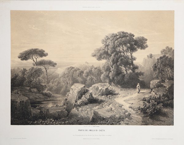 Litografia tinta raffigurante dintorni di Formia, probabilmente la vista da Maranola o la valle dell'Aurente. La litografia deriva dal dipinto di Hugo Ritter ed è pubblicata nel Wiener Kunstler Album. In ottimo stato di conservazione. Rara. Litografia tinta raffigurante dintorni di Formia, probabilmente la vista da Maranola o la valle dell'Aurente. La litografia deriva dal dipinto di Hugo Ritter ed è pubblicata nel Wiener Kunstler Album. In ottimo stato di conservazione. Rara. Cfr.