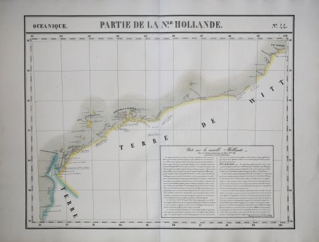 Carta apparsa nella sesta parte, "Océanique", ' dell'Atlas universel de géographie physique, politique, statistique et minéralogique ' di Vandermaelen. L'atlante fu prodotto in un'unica edizione nel 1827; furono venduti solo 810 esemplari completi. ' ' Questa grande opera, che comprende circa 378 mappe uniche e che fu compilata nell'arco di tre anni, fu il primo atlante litografico e il primo a rappresentare il mondo con la stessa proiezione e in una scala uniforme. Philippe Marie Guillaume Vandermaelen è stato un cartografo fiammingo attivo a Bruxelles nella prima parte del XIX secolo. A Vandermaelen si deve uno dei più notevoli sviluppi dell'impresa privata nella cartografia, ovvero il suo straordinario ' Atlas Universel de Geographie ' in sei volumi. Vandermaelen, nato a Bruxelles il 23 dicembre 1795, viene considerato come il più grande cartografo belga dopo Mercatore e Ortelius. Figlio di un medico che era diventato un ricco produttore di sapone, muovendosi in un ambiente commerciale e da autodidatta, divenne un commerciante di prodotti chimici e farmaceutici. Fanatico di geografia, la sua carriera subisce una svolta definitiva quando, nel 1825, inizia a pubblicare un rivoluzionario ' Atlas universel ' che lo consacra come cartografo. Primo atlante al mondo a rappresentare la Terra su una scala unica ed eccezionalmente grande, ' l'Atlas universel ' offriva la rappresentazione più ampia, completa e precisa mai realizzata. I suoi contemporanei lo capirono, come la Chiesa cattolica romana, che era in una fase di espansione. Negli anni Trenta del XIX secolo, Roma sosteneva che questo atlante era assolutamente il miglior atlante disponibile, prezioso strumento della sua politica missionaria nell'Oceano Pacifico e nelle isole meridionali. Bibliografia Marguerite Silvestre, ' Philippe Vandermaelen, ' Mercator de la jeune Belgique, ' 2016. Map appeared in the sixth part, 'Océanique,' of Vandermaelen's ' Atlas universel de géographie physique, politique, statistique et minéralogique. The atlas was produced in one edition in 1827; only 810 complete sets were sold. ' ' This great work, featuring some 378 unique maps and compiled over three years, was the first lithograph atlas, and the first to render the world on the same projection and at a uniform scale. Philippe Marie Guillaume Vandermaelen (December 23, 1795 - May 29, 1869) was a Flemish cartographer active in Brussels during the first part of the 19th century. Vandermaelen is created with "one of the most remarkable developments of private enterprise in cartography," namely his remarkable six volume ' Atlas Universel de Geographie. No one could have foreseen that Philippe Vandermaelen, born in Brussels on 23 December 1795, would become the greatest Belgian cartographer since Mercator and Ortelius. Son of a doctor who had become a wealthy soap maker, moving in a business environment and self-taught, he became a dealer of chemical and pharmaceutical products. As a geography fanatic, there was a definitive shift in his career when, in 1825, he began to publish a revolutionary ' Atlas universel ' which established him as a cartographer. As the first atlas in the world to represent the Earth on a single and exceptionally large scale, the ' Atlas universel ' offered the widest, most complete and most precise representation ever achieved. His contemporaries understood this, such as the Roman Catholic Church, which was in a phase of expansion. In the 1830s, Rome claimed that this atlas was “the best atlas available” and was the instrument of its missionary policy in the Pacific Ocean and the southern islands. Litograph, with original outline colour, very good condition. Bibliografia Marguerite Silvestre, ' Philippe Vandermaelen, ' Mercator de la jeune Belgique, ' 2016. Cfr.