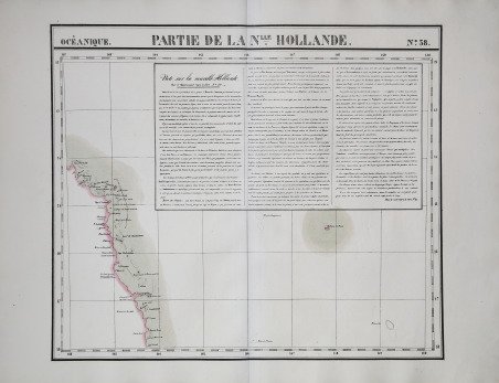 Carta apparsa nella sesta parte, "Océanique", ' dell'Atlas universel de géographie physique, politique, statistique et minéralogique ' di Vandermaelen. L'atlante fu prodotto in un'unica edizione nel 1827; furono venduti solo 810 esemplari completi. ' ' Questa grande opera, che comprende circa 378 mappe uniche e che fu compilata nell'arco di tre anni, fu il primo atlante litografico e il primo a rappresentare il mondo con la stessa proiezione e in una scala uniforme. Philippe Marie Guillaume Vandermaelen è stato un cartografo fiammingo attivo a Bruxelles nella prima parte del XIX secolo. A Vandermaelen si deve uno dei più notevoli sviluppi dell'impresa privata nella cartografia, ovvero il suo straordinario ' Atlas Universel de Geographie ' in sei volumi. Vandermaelen, nato a Bruxelles il 23 dicembre 1795, viene considerato come il più grande cartografo belga dopo Mercatore e Ortelius. Figlio di un medico che era diventato un ricco produttore di sapone, muovendosi in un ambiente commerciale e da autodidatta, divenne un commerciante di prodotti chimici e farmaceutici. Fanatico di geografia, la sua carriera subisce una svolta definitiva quando, nel 1825, inizia a pubblicare un rivoluzionario ' Atlas universel ' che lo consacra come cartografo. Primo atlante al mondo a rappresentare la Terra su una scala unica ed eccezionalmente grande, ' l'Atlas universel ' offriva la rappresentazione più ampia, completa e precisa mai realizzata. I suoi contemporanei lo capirono, come la Chiesa cattolica romana, che era in una fase di espansione. Negli anni Trenta del XIX secolo, Roma sosteneva che questo atlante era assolutamente il miglior atlante disponibile, prezioso strumento della sua politica missionaria nell'Oceano Pacifico e nelle isole meridionali. Bibliografia Marguerite Silvestre, ' Philippe Vandermaelen, ' Mercator de la jeune Belgique, ' 2016. Map appeared in the sixth part, 'Océanique,' of Vandermaelen's ' Atlas universel de géographie physique, politique, statistique et minéralogique. The atlas was produced in one edition in 1827; only 810 complete sets were sold. ' ' This great work, featuring some 378 unique maps and compiled over three years, was the first lithograph atlas, and the first to render the world on the same projection and at a uniform scale. Philippe Marie Guillaume Vandermaelen (December 23, 1795 - May 29, 1869) was a Flemish cartographer active in Brussels during the first part of the 19th century. Vandermaelen is created with "one of the most remarkable developments of private enterprise in cartography," namely his remarkable six volume ' Atlas Universel de Geographie. No one could have foreseen that Philippe Vandermaelen, born in Brussels on 23 December 1795, would become the greatest Belgian cartographer since Mercator and Ortelius. Son of a doctor who had become a wealthy soap maker, moving in a business environment and self-taught, he became a dealer of chemical and pharmaceutical products. As a geography fanatic, there was a definitive shift in his career when, in 1825, he began to publish a revolutionary ' Atlas universel ' which established him as a cartographer. As the first atlas in the world to represent the Earth on a single and exceptionally large scale, the ' Atlas universel ' offered the widest, most complete and most precise representation ever achieved. His contemporaries understood this, such as the Roman Catholic Church, which was in a phase of expansion. In the 1830s, Rome claimed that this atlas was “the best atlas available” and was the instrument of its missionary policy in the Pacific Ocean and the southern islands. Litograph, with original outline colour, very good condition. Bibliografia Marguerite Silvestre, ' Philippe Vandermaelen, ' Mercator de la jeune Belgique, ' 2016. Cfr.