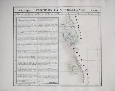 Carta apparsa nella sesta parte, "Océanique", ' dell'Atlas universel de géographie physique, politique, statistique et minéralogique ' di Vandermaelen. L'atlante fu prodotto in un'unica edizione nel 1827; furono venduti solo 810 esemplari completi. ' ' Questa grande opera, che comprende circa 378 mappe uniche e che fu compilata nell'arco di tre anni, fu il primo atlante litografico e il primo a rappresentare il mondo con la stessa proiezione e in una scala uniforme. Philippe Marie Guillaume Vandermaelen è stato un cartografo fiammingo attivo a Bruxelles nella prima parte del XIX secolo. A Vandermaelen si deve uno dei più notevoli sviluppi dell'impresa privata nella cartografia, ovvero il suo straordinario ' Atlas Universel de Geographie ' in sei volumi. Vandermaelen, nato a Bruxelles il 23 dicembre 1795, viene considerato come il più grande cartografo belga dopo Mercatore e Ortelius. Figlio di un medico che era diventato un ricco produttore di sapone, muovendosi in un ambiente commerciale e da autodidatta, divenne un commerciante di prodotti chimici e farmaceutici. Fanatico di geografia, la sua carriera subisce una svolta definitiva quando, nel 1825, inizia a pubblicare un rivoluzionario ' Atlas universel ' che lo consacra come cartografo. Primo atlante al mondo a rappresentare la Terra su una scala unica ed eccezionalmente grande, ' l'Atlas universel ' offriva la rappresentazione più ampia, completa e precisa mai realizzata. I suoi contemporanei lo capirono, come la Chiesa cattolica romana, che era in una fase di espansione. Negli anni Trenta del XIX secolo, Roma sosteneva che questo atlante era assolutamente il miglior atlante disponibile, prezioso strumento della sua politica missionaria nell'Oceano Pacifico e nelle isole meridionali. Bibliografia Marguerite Silvestre, ' Philippe Vandermaelen, ' Mercator de la jeune Belgique, ' 2016. Map appeared in the sixth part, 'Océanique,' of Vandermaelen's ' Atlas universel de géographie physique, politique, statistique et minéralogique. The atlas was produced in one edition in 1827; only 810 complete sets were sold. ' ' This great work, featuring some 378 unique maps and compiled over three years, was the first lithograph atlas, and the first to render the world on the same projection and at a uniform scale. Philippe Marie Guillaume Vandermaelen (December 23, 1795 - May 29, 1869) was a Flemish cartographer active in Brussels during the first part of the 19th century. Vandermaelen is created with "one of the most remarkable developments of private enterprise in cartography," namely his remarkable six volume ' Atlas Universel de Geographie. No one could have foreseen that Philippe Vandermaelen, born in Brussels on 23 December 1795, would become the greatest Belgian cartographer since Mercator and Ortelius. Son of a doctor who had become a wealthy soap maker, moving in a business environment and self-taught, he became a dealer of chemical and pharmaceutical products. As a geography fanatic, there was a definitive shift in his career when, in 1825, he began to publish a revolutionary ' Atlas universel ' which established him as a cartographer. As the first atlas in the world to represent the Earth on a single and exceptionally large scale, the ' Atlas universel ' offered the widest, most complete and most precise representation ever achieved. His contemporaries understood this, such as the Roman Catholic Church, which was in a phase of expansion. In the 1830s, Rome claimed that this atlas was “the best atlas available” and was the instrument of its missionary policy in the Pacific Ocean and the southern islands. Litograph, with original outline colour, very good condition. Bibliografia Marguerite Silvestre, ' Philippe Vandermaelen, ' Mercator de la jeune Belgique, ' 2016. Cfr.
