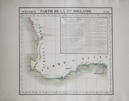 Carta apparsa nella sesta parte, "Océanique", ' dell'Atlas universel de géographie physique, politique, statistique et minéralogique ' di Vandermaelen. L'atlante fu prodotto in un'unica edizione nel 1827; furono venduti solo 810 esemplari completi. ' ' Questa grande opera, che comprende circa 378 mappe uniche e che fu compilata nell'arco di tre anni, fu il primo atlante litografico e il primo a rappresentare il mondo con la stessa proiezione e in una scala uniforme. Philippe Marie Guillaume Vandermaelen è stato un cartografo fiammingo attivo a Bruxelles nella prima parte del XIX secolo. A Vandermaelen si deve uno dei più notevoli sviluppi dell'impresa privata nella cartografia, ovvero il suo straordinario ' Atlas Universel de Geographie ' in sei volumi. Vandermaelen, nato a Bruxelles il 23 dicembre 1795, viene considerato come il più grande cartografo belga dopo Mercatore e Ortelius. Figlio di un medico che era diventato un ricco produttore di sapone, muovendosi in un ambiente commerciale e da autodidatta, divenne un commerciante di prodotti chimici e farmaceutici. Fanatico di geografia, la sua carriera subisce una svolta definitiva quando, nel 1825, inizia a pubblicare un rivoluzionario ' Atlas universel ' che lo consacra come cartografo. Primo atlante al mondo a rappresentare la Terra su una scala unica ed eccezionalmente grande, ' l'Atlas universel ' offriva la rappresentazione più ampia, completa e precisa mai realizzata. I suoi contemporanei lo capirono, come la Chiesa cattolica romana, che era in una fase di espansione. Negli anni Trenta del XIX secolo, Roma sosteneva che questo atlante era assolutamente il miglior atlante disponibile, prezioso strumento della sua politica missionaria nell'Oceano Pacifico e nelle isole meridionali. Bibliografia Marguerite Silvestre, ' Philippe Vandermaelen, ' Mercator de la jeune Belgique, ' 2016. Map appeared in the sixth part, 'Océanique,' of Vandermaelen's ' Atlas universel de géographie physique, politique, statistique et minéralogique. The atlas was produced in one edition in 1827; only 810 complete sets were sold. ' ' This great work, featuring some 378 unique maps and compiled over three years, was the first lithograph atlas, and the first to render the world on the same projection and at a uniform scale. Philippe Marie Guillaume Vandermaelen (December 23, 1795 - May 29, 1869) was a Flemish cartographer active in Brussels during the first part of the 19th century. Vandermaelen is created with "one of the most remarkable developments of private enterprise in cartography," namely his remarkable six volume ' Atlas Universel de Geographie. No one could have foreseen that Philippe Vandermaelen, born in Brussels on 23 December 1795, would become the greatest Belgian cartographer since Mercator and Ortelius. Son of a doctor who had become a wealthy soap maker, moving in a business environment and self-taught, he became a dealer of chemical and pharmaceutical products. As a geography fanatic, there was a definitive shift in his career when, in 1825, he began to publish a revolutionary ' Atlas universel ' which established him as a cartographer. As the first atlas in the world to represent the Earth on a single and exceptionally large scale, the ' Atlas universel ' offered the widest, most complete and most precise representation ever achieved. His contemporaries understood this, such as the Roman Catholic Church, which was in a phase of expansion. In the 1830s, Rome claimed that this atlas was “the best atlas available” and was the instrument of its missionary policy in the Pacific Ocean and the southern islands. Litograph, with original outline colour, very good condition. Bibliografia Marguerite Silvestre, ' Philippe Vandermaelen, ' Mercator de la jeune Belgique, ' 2016. Cfr.