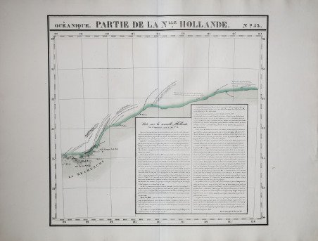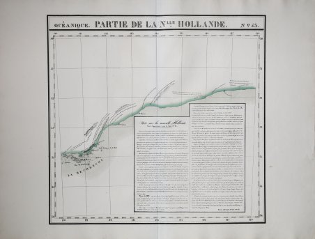 Carta apparsa nella sesta parte, "Océanique", ' dell'Atlas universel de géographie physique, politique, statistique et minéralogique ' di Vandermaelen. L'atlante fu prodotto in un'unica edizione nel 1827; furono venduti solo 810 esemplari completi. ' ' Questa grande opera, che comprende circa 378 mappe uniche e che fu compilata nell'arco di tre anni, fu il primo atlante litografico e il primo a rappresentare il mondo con la stessa proiezione e in una scala uniforme. Philippe Marie Guillaume Vandermaelen è stato un cartografo fiammingo attivo a Bruxelles nella prima parte del XIX secolo. A Vandermaelen si deve uno dei più notevoli sviluppi dell'impresa privata nella cartografia, ovvero il suo straordinario ' Atlas Universel de Geographie ' in sei volumi. Vandermaelen, nato a Bruxelles il 23 dicembre 1795, viene considerato come il più grande cartografo belga dopo Mercatore e Ortelius. Figlio di un medico che era diventato un ricco produttore di sapone, muovendosi in un ambiente commerciale e da autodidatta, divenne un commerciante di prodotti chimici e farmaceutici. Fanatico di geografia, la sua carriera subisce una svolta definitiva quando, nel 1825, inizia a pubblicare un rivoluzionario ' Atlas universel ' che lo consacra come cartografo. Primo atlante al mondo a rappresentare la Terra su una scala unica ed eccezionalmente grande, ' l'Atlas universel ' offriva la rappresentazione più ampia, completa e precisa mai realizzata. I suoi contemporanei lo capirono, come la Chiesa cattolica romana, che era in una fase di espansione. Negli anni Trenta del XIX secolo, Roma sosteneva che questo atlante era assolutamente il miglior atlante disponibile, prezioso strumento della sua politica missionaria nell'Oceano Pacifico e nelle isole meridionali. Bibliografia Marguerite Silvestre, ' Philippe Vandermaelen, ' Mercator de la jeune Belgique, ' 2016. Map appeared in the sixth part, 'Océanique,' of Vandermaelen's ' Atlas universel de géographie physique, politique, statistique et minéralogique. The atlas was produced in one edition in 1827; only 810 complete sets were sold. ' ' This great work, featuring some 378 unique maps and compiled over three years, was the first lithograph atlas, and the first to render the world on the same projection and at a uniform scale. Philippe Marie Guillaume Vandermaelen (December 23, 1795 - May 29, 1869) was a Flemish cartographer active in Brussels during the first part of the 19th century. Vandermaelen is created with "one of the most remarkable developments of private enterprise in cartography," namely his remarkable six volume ' Atlas Universel de Geographie. No one could have foreseen that Philippe Vandermaelen, born in Brussels on 23 December 1795, would become the greatest Belgian cartographer since Mercator and Ortelius. Son of a doctor who had become a wealthy soap maker, moving in a business environment and self-taught, he became a dealer of chemical and pharmaceutical products. As a geography fanatic, there was a definitive shift in his career when, in 1825, he began to publish a revolutionary ' Atlas universel ' which established him as a cartographer. As the first atlas in the world to represent the Earth on a single and exceptionally large scale, the ' Atlas universel ' offered the widest, most complete and most precise representation ever achieved. His contemporaries understood this, such as the Roman Catholic Church, which was in a phase of expansion. In the 1830s, Rome claimed that this atlas was “the best atlas available” and was the instrument of its missionary policy in the Pacific Ocean and the southern islands. Litograph, with original outline colour, very good condition. Bibliografia Marguerite Silvestre, ' Philippe Vandermaelen, ' Mercator de la jeune Belgique, ' 2016. Cfr.