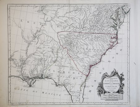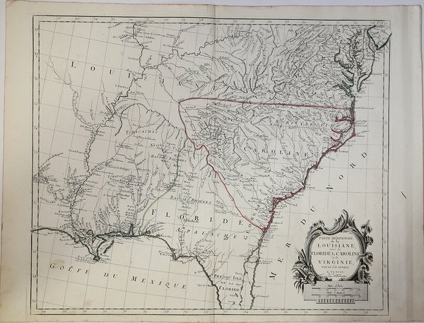 Mappa particolareggiata della parte sudorientale degli Stati Uniti basata su quella di d'Anville, che l'autore cita nel cartiglio ornamentale con il titolo, in basso a sinistra.Viene rappresentata gran parte della Florida, ad ovest di Natchitoches e del fiume Arkansas, a nord lungo il fiume Mississippi, fino alla zona di Fort de Chartes e poi a est lungo il fiume Ohio, arrivando ad includere tutta la Virginia, Chesapeake e la parte del Maryland.Una delle migliori mappe di grande formato prodotte alla vigilia della Rivoluzione Americana e che raramente appare sul mercato. Carta geografica curata da don Paolo Santini e dal fratello Francesco per il loro prestigioso Atlas universel dressé sur les meilleures cartes modernes, sontuoso atlante composto da mappe che rielaborano la più aggiornata cartografia francese in una veste veneta. Le carte sono prese dai migliori geografi del suo tempo, D’Anville, Bellin, Bonne, Borgomo, Boscovich, Clarici, Delisle, Jaillot, Janvier, Robert de Vaugondy. ' In effetti nelle carte dei Santini, vengono mescolati termini francesi con italiani, ma sono offerte con una grazia compositiva ed incisoria loro caratteristiche: una toponomastica non fitta, scritta in grande e ben leggibile. L’atlante di Santini non ebbe una grande fortuna editoriale e uscì in poche copie: venne quindi ristampato dai Remondini, che avevano acquistato dal Santini nel 1781 le incisioni in rame. Alle carte di Paolo Santini, datate fra il 1774 e il 1780, i Remondini aggiunsero diverse altre carte, datate fra il 1782 e il 1784: fra queste, nel secondo volume, la grande carte ripiegata dell’Italia, la Repubblica di Genova, la Palestina, le grandi carte dell’Africa. Paolo Santini (1729, Venezia–1793, Belluno), sacerdote cattolico presso la Chiesa di Santa Maria Formosa a Venezia, docente di disegno alle scuole della città lagunare della Provincia Veneta della Compagnia di Gesù. Santini, cartografo, incisore ed editore, aggiornò e pubblicò le mappe dei geografi e cartografi francesi Gilles Robert de Vaugondy (1688–1766) e Didier Robert de Vaugondy (c. 1723–1786), ispirandosi anche alle opere dei cartografi italiani, innanzitutto a quelle di Giovanni Antonio Rizzi Zannoni (1736–1814). Utilizzando, come modello, le mappe raccolte e pubblicate nel 1752 nell’Atlas Universel di Gilles Robert e Didier Robert de Vaugondy, acquistate a Parigi da suo fratello, Francesco Santini, e le «migliori carte geografiche» dell’epoca, Paolo Santini incise nuove lastre e diede alle stampe a Venezia, nel 1776, l’Atlas Universel dressé sur les meilleures cartes modernes. L’anno successivo, 1777, cedette i diritti di pubblicazione all’editore Giuseppe Remondini (1754–1811) di Bassano del Grappa che ristampò l’«Atlas Universel» in due volumi che raccoglievano complessivamente 123 carte geografiche. Le matrici in rame in possesso dei Santini furono poi acquistate, nel 178, dalla stamperia Remondini. Incisione in rame, coloritura coeva dei contorni, in ottimo stato di conservazione. Bibliografia NMM III, 277; Nordenskiöld 276; Phillips, Atlases 647. Rodolfo Gallo, L'incisione nel '700 a Venezia e a Bassano, in “Ateneo Veneto”, A. CXXXII, v. 128, pp. 153-214. Fine map of southeastern part of the United States after d'Anville's, to whom Santini gives credit in the cartouche.It covering most of Florida, west to Natchitoches and the Arkansas River, north along the Mississippi River to the Fort de Chartes area and then east along the Ohio River, extneing to include all of Virginia, the Chesapeake and most of Maryland. One of the best large format atlas maps produced on the eve of the American Revolution and a map that rarely appears on the market. Map compiled by Don Paolo Santini and his brother Francesco, for their prestigious Atlas universel dressé sur les meilleures cartes modernes, a sumptuous Atlas composed of maps that rework the most up-to-date French cartography in a Venetian guise. The maps are taken from the best geographers of his time, D'Anville, Bellin, Bonne, Borgomo, Boscovich, Clarici, Delisle, Jaillot, Janvier, Robert de Vaugondy. ' Indeed, in Santini's maps, French terms are mixed with Italian, but they are offered with a compositional and engraving grace that is characteristic of them: an uncluttered toponymy, written large and clearly legible. Santini's Atlas did not have great publishing success and came out in few copies: it was then reprinted by the Remondini, who had purchased the copperplates from Santini in 1781. To Paolo Santini's maps, dated between 1774 and 1780, the Remondini added several other maps, dated between 1782 and 1784: among them, in the second volume, the large folded maps of Italy, the Republic of Genoa, Palestine, and the large maps of Africa. Paolo Santini (1729, Venice-1793, Belluno), Catholic priest at the Church of Santa Maria Formosa in Venice, professor of drawing at schools in the Lagooon city of the Venetian Province of the Society of Jesus. Santini, a cartographer, engraver and publisher, updated and published the maps of French geographers and cartographers Gilles Robert de Vaugondy (1688-1766) and Didier Robert de Vaugondy (c. 1723-1786), also drawing inspiration from the works of Italian cartographers, first and foremost those of Giovanni Antonio Rizzi Zannoni (1736-1814). Using, as a model, the maps collected and published in 1752 in the Atlas Universel by Gilles Robert and Didier Robert de Vaugondy, purchased in Paris by his brother, Francesco Santini, and the "best maps" of the time, Paolo Santini engraved new plates and gave to the presses in Venice, in 1776, the Atlas Universel dressé sur les meilleures cartes modernes. The following year, 1777, he sold the publishing rights to publisher Giuseppe Remondini (1754-1811) of Bassano del Grappa, who reprinted the "Atlas Universel" in two volumes that collected a total of 123 maps. The copper plates in the Santini's possession were later purchased, in 1781, by the Remond