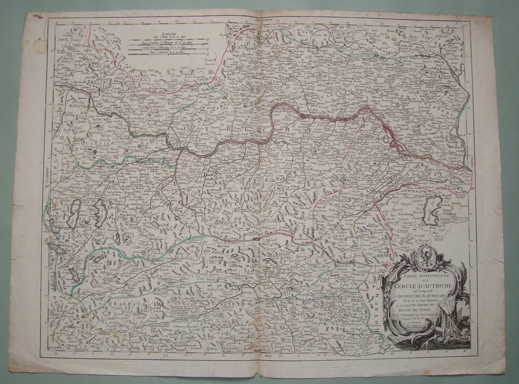 DE VAUGONDY R. Partie septentrionale du Cercle d’Autriche. Venice, 1777. Double page engraved map by Santini after Robert De Vaugondy. Contemp. hand coloured in outline. Cartouche. Inches 19 1/2 x 24 1/2 (Cm. 49x62).